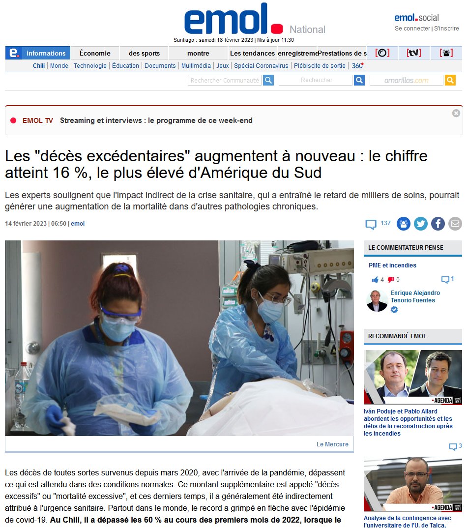 🇨🇱 Chili 14 février 2023 Emol La surmortalité a dépassé 60% au premier trimestre 2022 (nda : le Chili a connu un pic de 62,76% en février 2022, c'est le pays le + "vacciné" d'Amérique latine : 90,27%) https://www.emol.com/noticias/Nacional/2023/02/14/1086671/muertes-exceso-cifra-alta-sudamerica.html