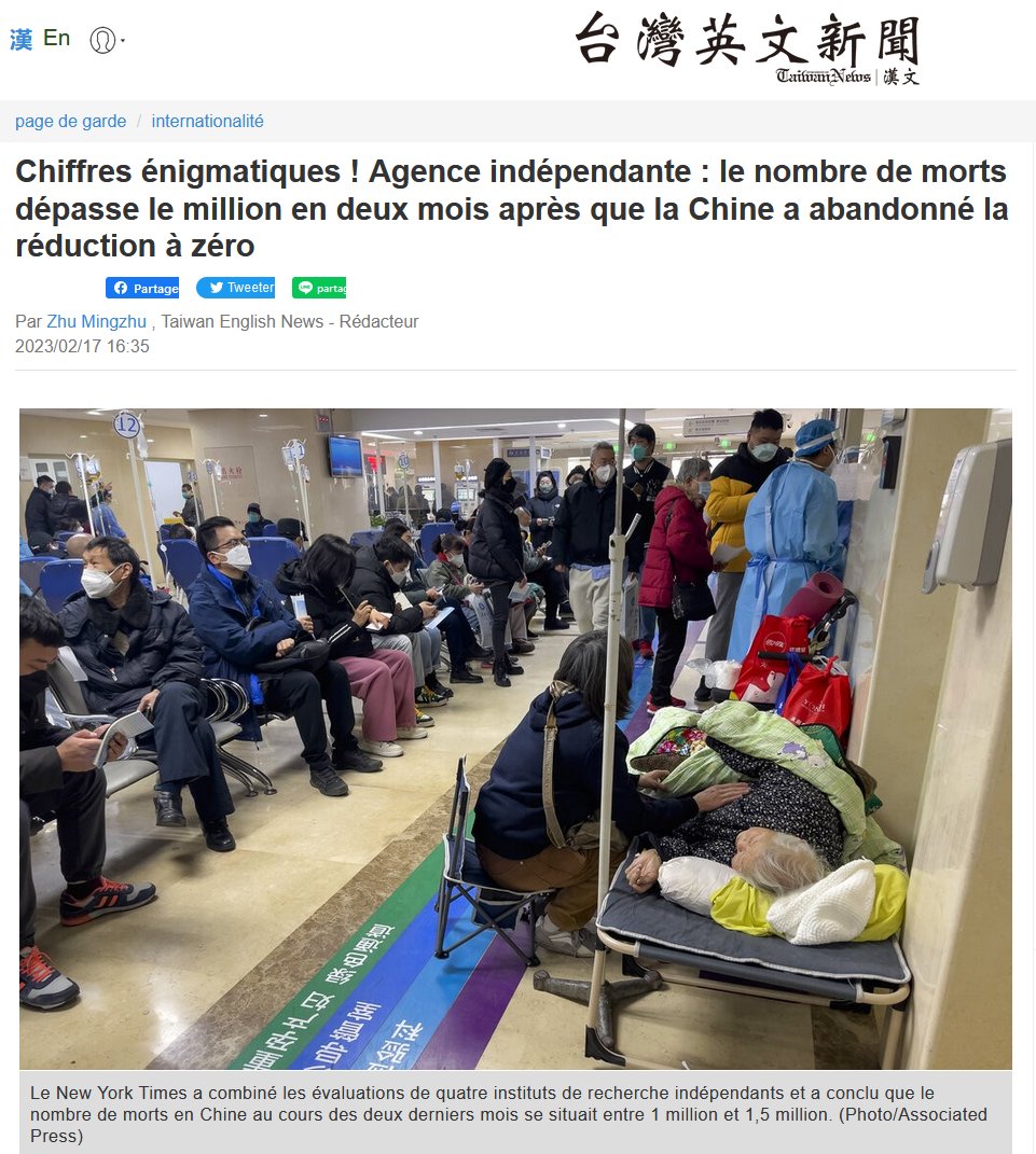 🇨🇳 Chine 17 février 2023 🇹🇼 Taïwan News Les statistiques combinées de 4 instituts de recherche indépendants estiment le nombre de morts entre 1 million et 1,5 million depuis l'assouplissement des mesures sanitaires, fin novembre 2022 (Source : NY Times) https://www.taiwannews.com.tw/ch/news/4813310