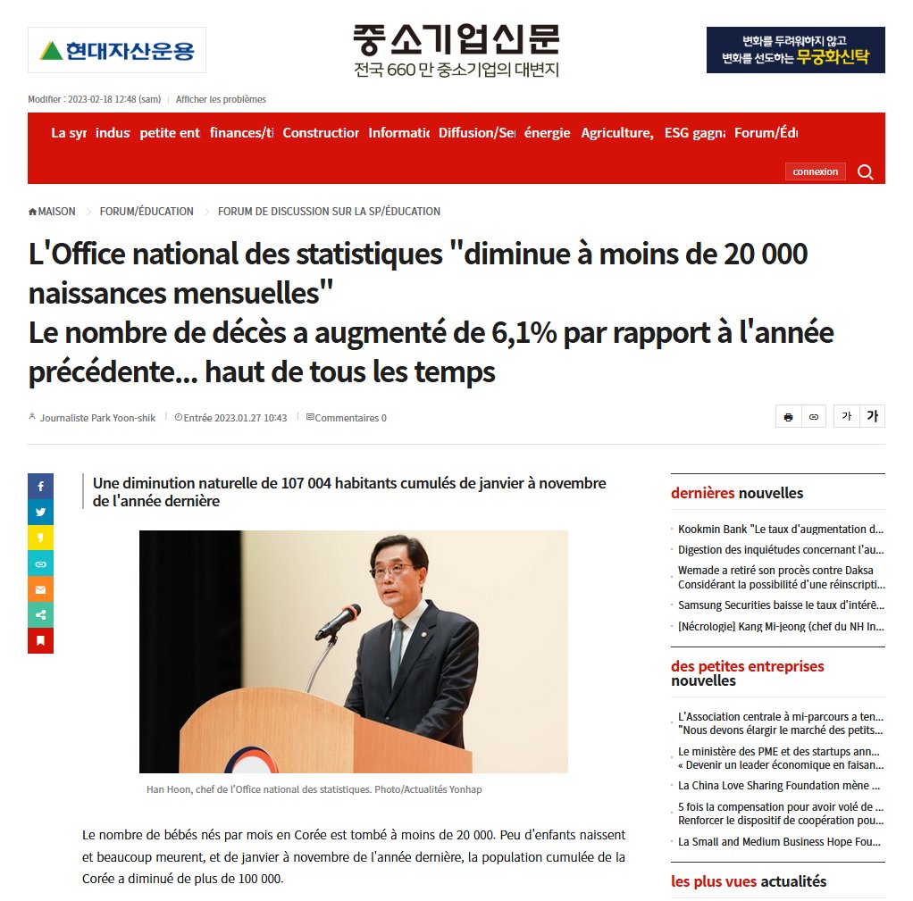 🇰🇷 Corée du Sud 27 janvier 2023 SME daily Record absolu des décès en décembre 2022 (+6,1% comparé à 2021) Le nombre de naissances en novembre 2022 était le plus bas depuis 1981. https://www.smedaily.co.kr/news/articleView.html?idxno=247934