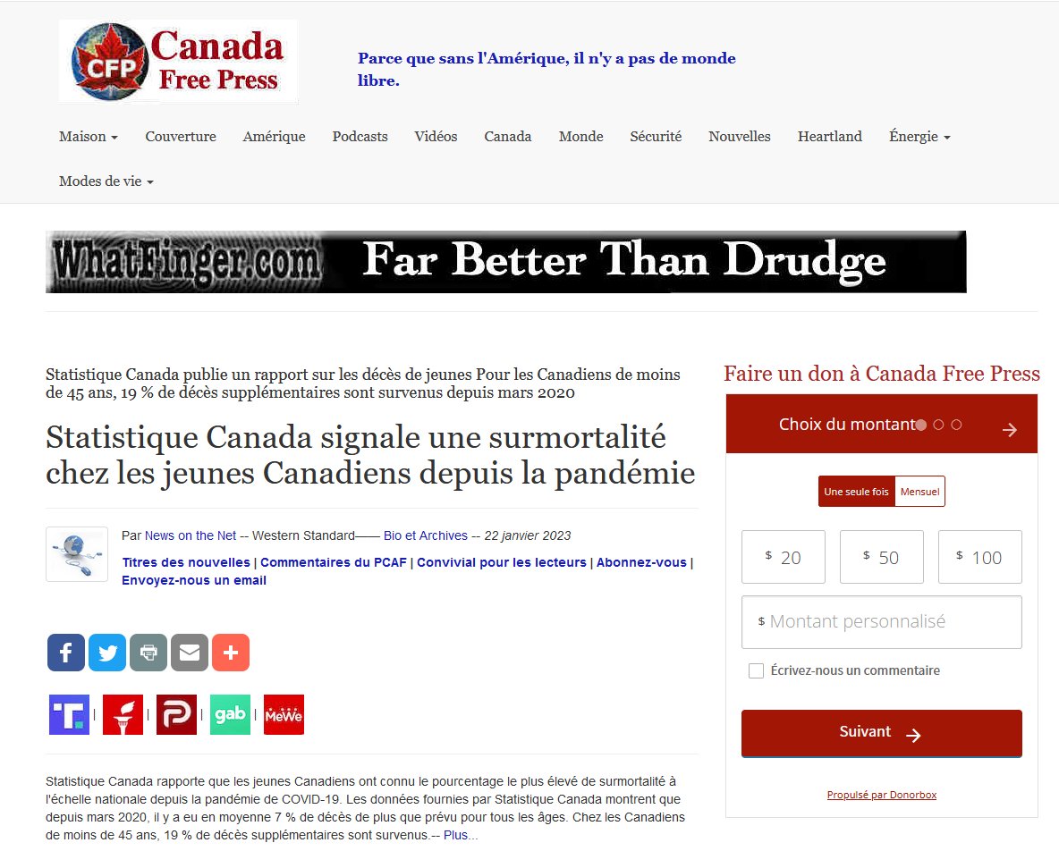 🇨🇦 Canada 22 janvier 2023 Canada free press Les données fournies par Statistique Canada montrent que depuis mars 2020, il y a eu en moyenne 7% de décès de plus que prévu pour tous les âges. 19% pour les moins de 45 ans. https://canadafreepress.com/article/stats-canada-reports-excess-mortality-among-younger-canadians-since-pandemic