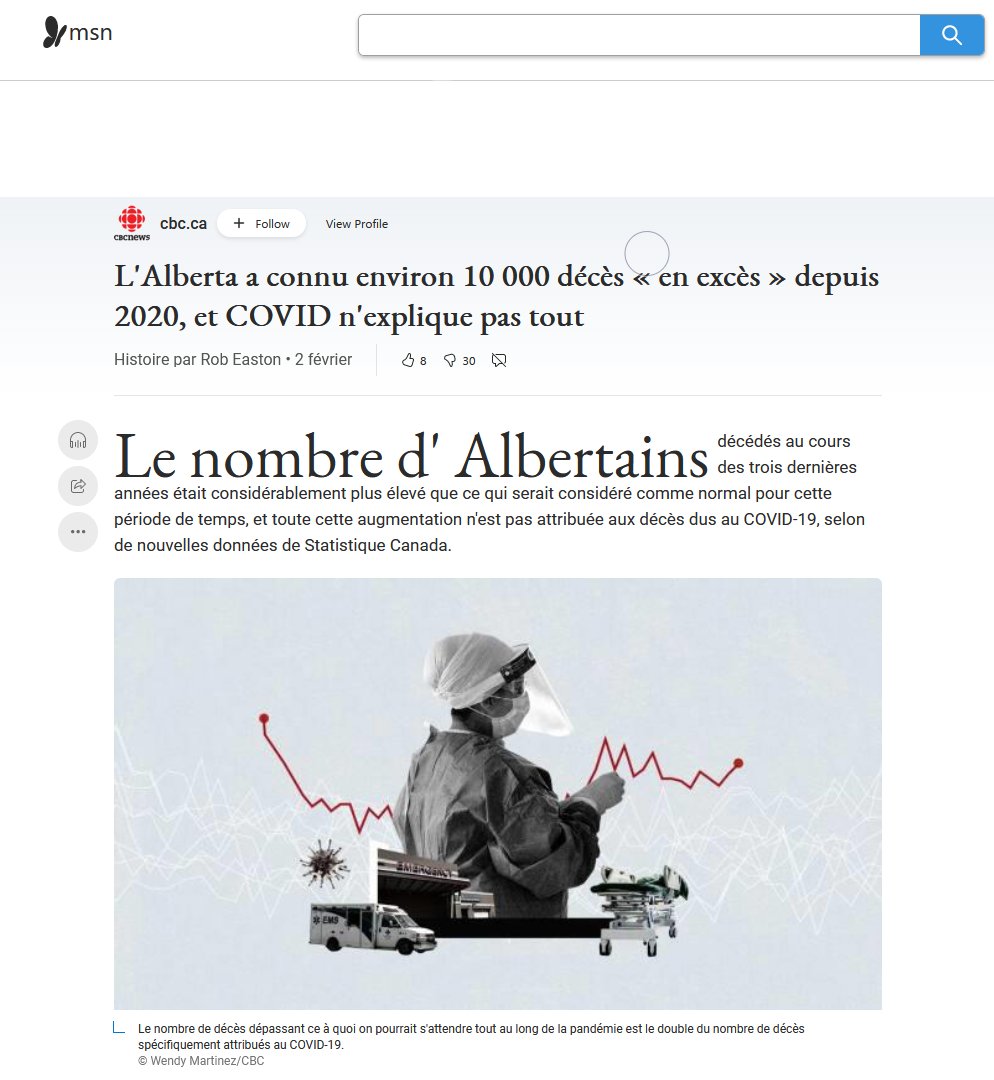 🇨🇦 Canada (bis) 2 février 2023 CBC News Province d'Alberta : surmortalité 10000 décès en trop https://www.msn.com/en-ca/news/canada/alberta-has-seen-roughly-10-000-excess-deaths-since-2020-and-covid-doesn-t-explain-it-all/ar-AA172PwI