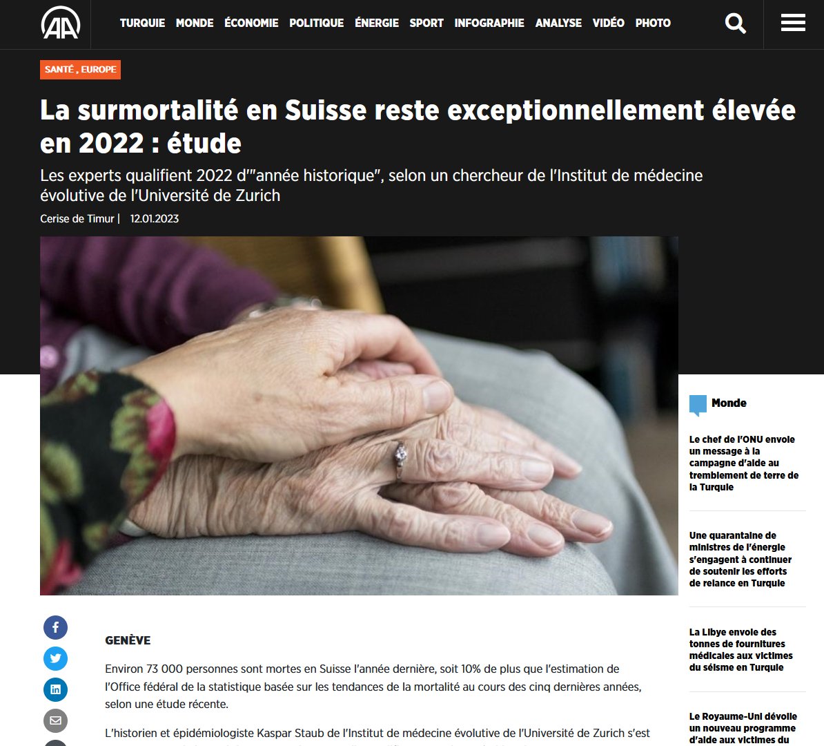 🇨🇭 Suisse 12 janvier 2023 AA "10% de (décès en) plus (en 2022) que l'estimation de l'Office fédéral de la statistique basée sur les tendances de la mortalité au cours des cinq dernières années." https://www.aa.com.tr/en/europe/excess-mortality-in-switzerland-remains-exceptionally-high-in-2022-study/2786223#
