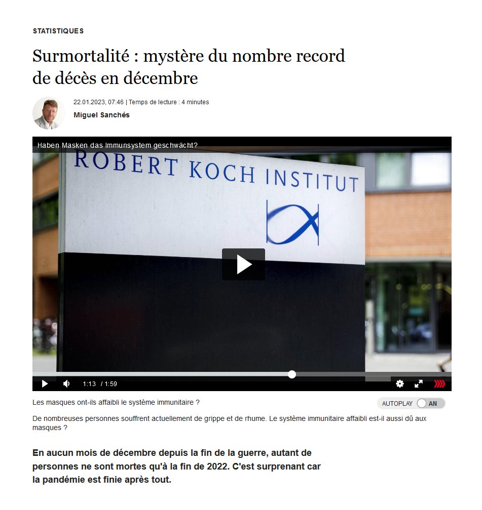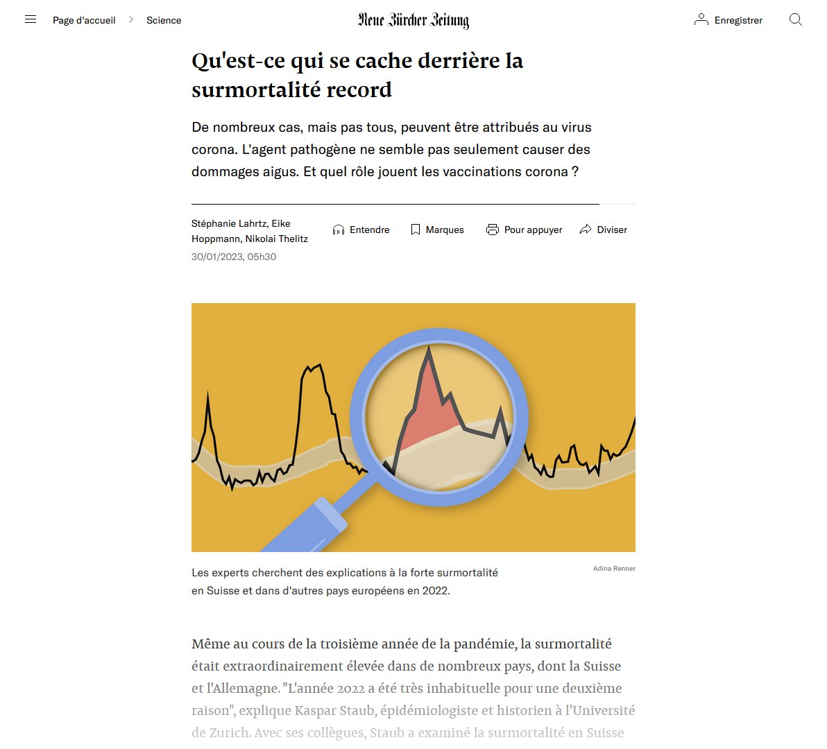 🇨🇭 Suisse (bis) 30 janvier 2023 NZZ En 2022 la surmortalité était exceptionnellement élevée, l'une des plus élevés depuis 1877. "Les experts cherchent des explications à la forte surmortalité en Suisse et dans d'autres pays européens en 2022." https://www.nzz.ch/wissenschaft/warum-war-die-uebersterblichkeit-2022-so-hoch-ld.1722186?reduced=true
