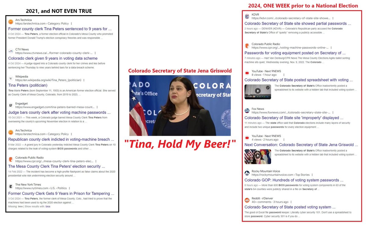 Jena, help me with this math here...You and others lied and put Tina, a GOLD STAR MOTHER in prison for 9 years for allegedly compromising her county's election equipment (even though she didn't). Now you actually DID post 600 passwords for the entire state of Colorado on your own website FOR MONTHS, then tried to hide it one week prior to a National Election. So....HOW MANY YEARS ARE YOU GOING AWAY FOR?