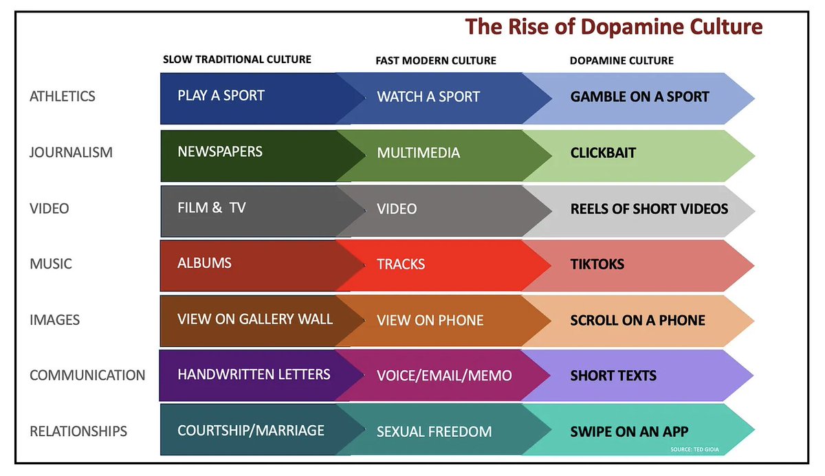 1. Dopamine Culture: “Every kind of organized distraction tends to become more and more imbecile.” — Aldous Huxley The delay between desire & gratification is shrinking. Pleasure is increasingly more instant & effortless. Everything is becoming a drug. What will it do to us? https://t.co/ZFrncYZNtC