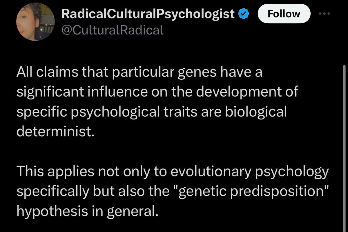 I think some people think there is a “blank slate” school of psychology. This basically doesn’t exist in 2024. A lot of people believe it, but within psychology there is overwhelming consensus that genetics contribute to behavior and human psychology. The gene x environment interaction is considered an axiom of personality psychology. That human evolution has shaped human psychology and behavior is also not merely a belief within the subdiscipline of evolutionary psychology. It’s simply a recognized fact by anyone who accepts that evolution is real. Human beings are animals and subject to the same evolutionary process as any other animal, which includes selection for behavioral traits, emotions, mental processes, and more. This is a fact of evolution and not a belief relegated to a niche or specific subdomain within psychology. Why do people form beliefs like this or adopt what is essentially fringe pseudoscience in the field? Probably political ideology.