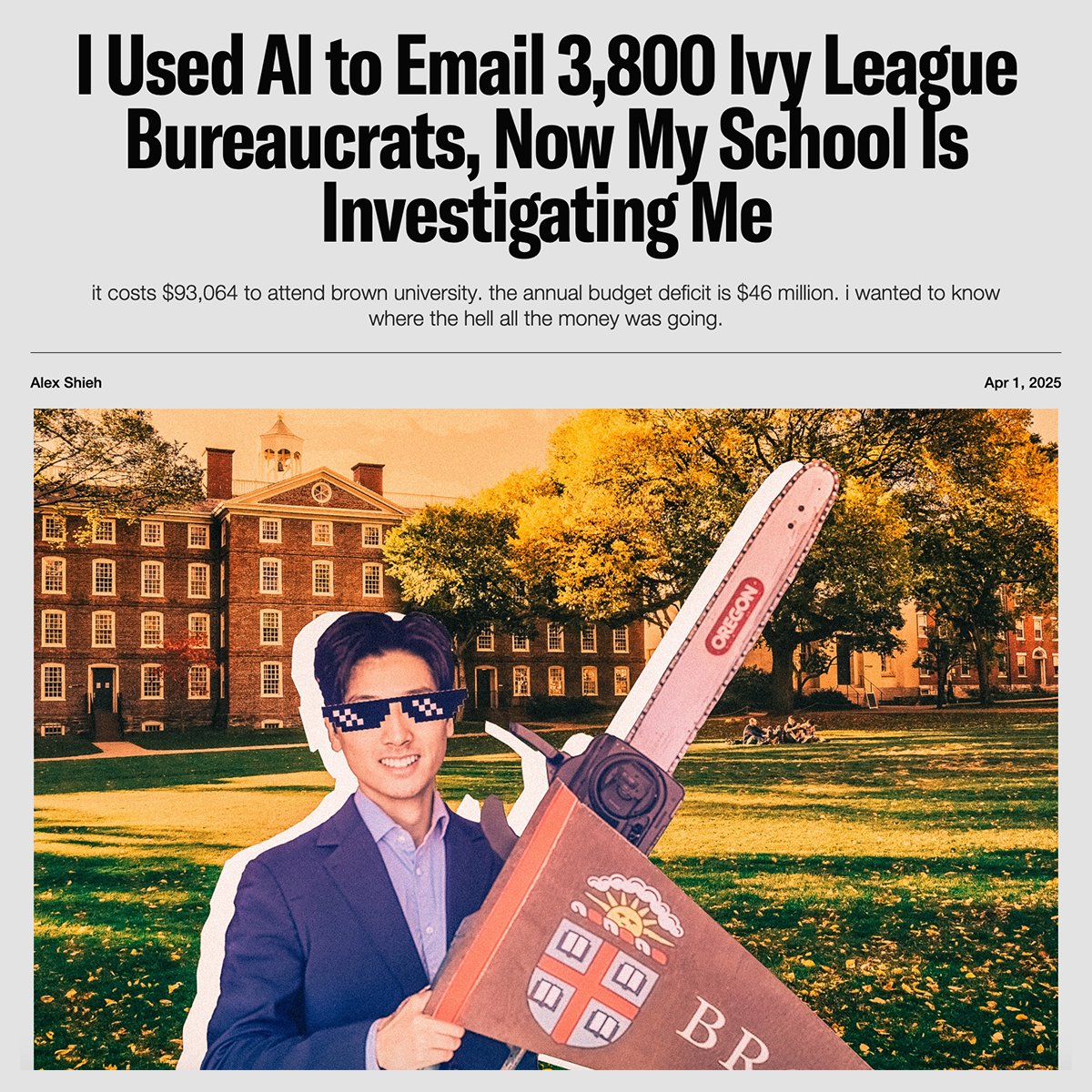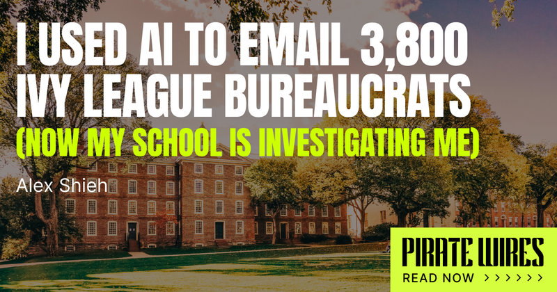 NEW: Brown University 'DOGE' student shares his side of the story with Pirate Wires At Brown University, there's roughly one non-faculty administrator for every two undergrads. Tuition, living expenses, and fees now amount to $93,064 a year. The school runs a $46 million annual budget deficit, and professors constantly complain they’re underpaid. Trying to make sense of this situation, Brown sophomore @alexkshieh emailed all 3,800+ administrators, asking a simple question: "What do you do all day?" Among the few responses he did get, one person replied "fuck you," and another told him to “stick an entire cactus up [his] ass.” Now, Shieh says Brown is investigating him for “emotional/psychological harm,” among other things. Today on PW, Alex tells his side of the story — and describes the aftermath. Link is threaded 👇