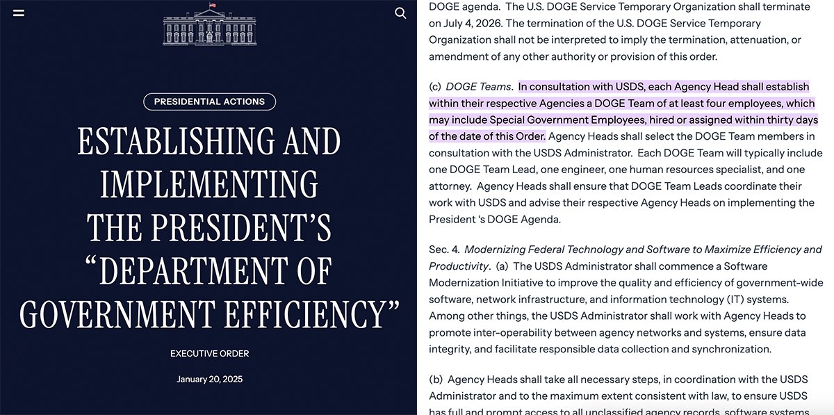 TRUMP EXECUTIVE ORDER OFFICIALLY ESTABLISHES DOGE • As of today, DOGE is established as a Temporary Organization in accordance with section 3161 of title 5, United States Code • The Organization will report to WH Chief of Staff Susie Wiles • Each Federal agency is tasked with setting up a "DOGE Team of at least four employees" within 30 days of today; each team "will typically include one DOGE Team Lead, one engineer, one human resources specialist, and one attorney" • DOGE will immediately establish a government-wide "Software Modernization Initiative" • DOGE will terminate on July 4, 2026