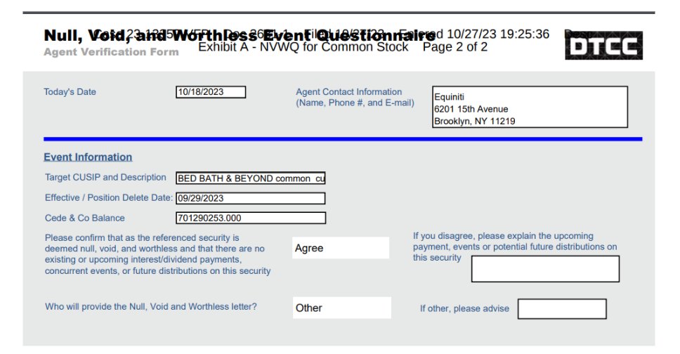 BBBYQ Update: CUSIPs are being removed from brokerage accounts. Robinhood & TDAmeritrade have both removed them all. You may need to call your broker to get them removed in order to claim the loss. Fidelity renamed it to "BED BATH AND BEYOND COM USD0.01 *EXPIRED POSITION*" today.