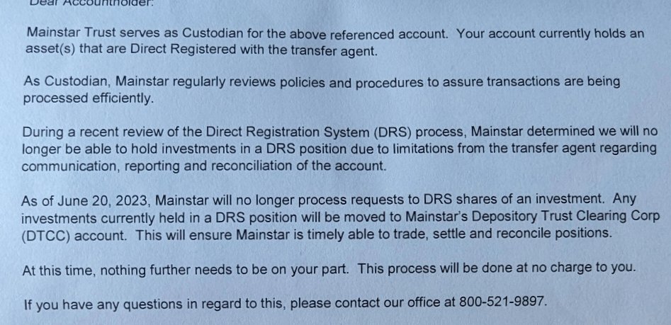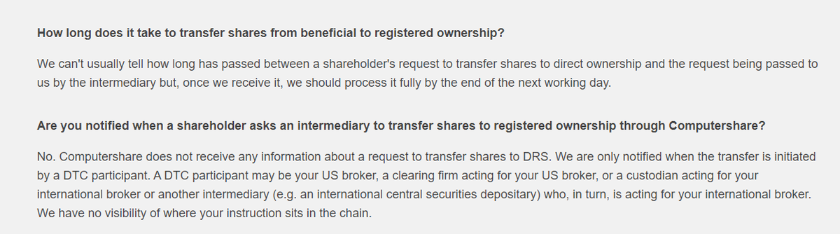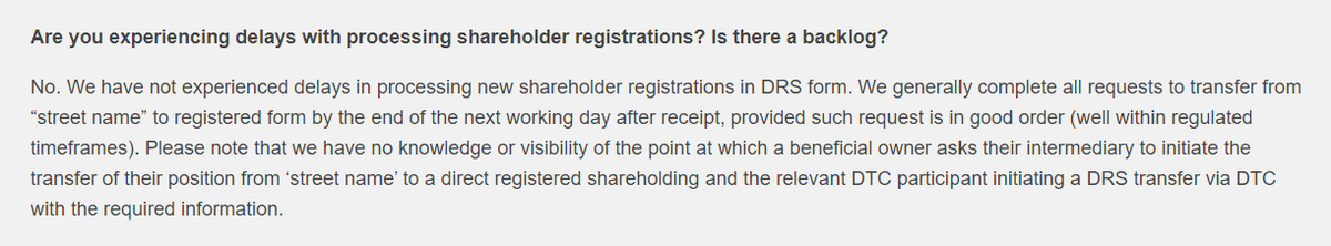 They're blaming @Computershare. She said it takes too long to get confirmation of DRSd shares, too long for shares to leave Computershare to get sent there for people to sell, and they don't get their monthly reconciliation reports fast enough