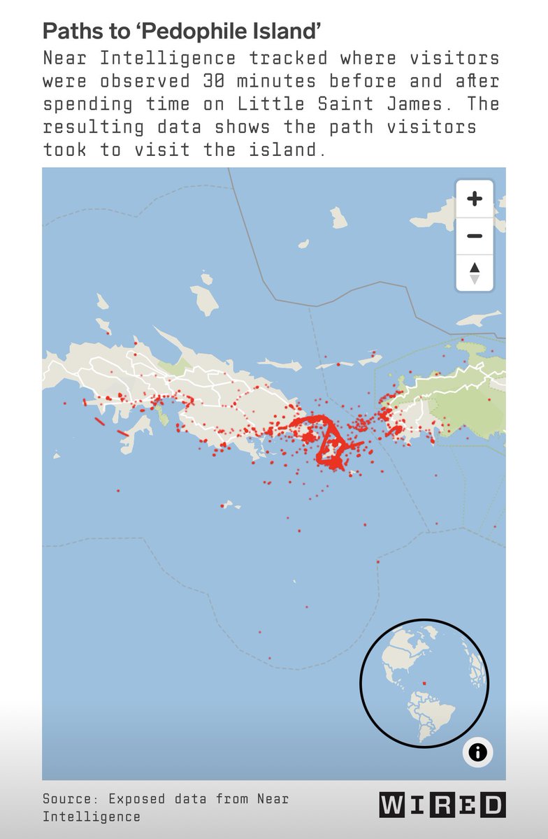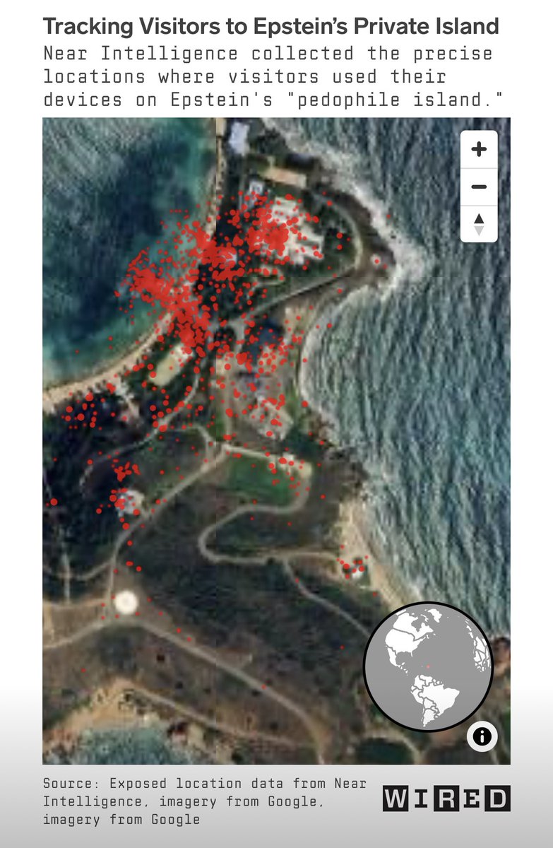 Release the names. Forward: “Jeffrey Epstein's Island Visitors Exposed by Data Broker NEARLY 200 MOBILE devices of people who visited Jeffrey Epstein’s notorious ‘pedophile island’ in the years prior to his death left an invisible trail of data pointing back to their own homes and offices. Maps of these visitations generated by a troubled international data broker with defense industry ties, discovered last week by WIRED, document the numerous trips of wealthy and influential individuals seemingly undeterred by Epstein’s status as a convicted sex offender. The coordinates that Near Intelligence collected and left exposed online pinpoint locations to within a few centimeters of space. Visitors were tracked as they moved from the Ritz-Carlton on neighboring St. Thomas Island, for instance, to a specific dock at the American Yacht Harbor—a marina once co-owned by Epstein that hosts an ‘impressive array’ of pleasure boats and mega-yachts. The data pinpointed their movements as they were transported to Epstein’s dock on Little St. James, revealing the exact routes taken to the island. The tracking continued after they arrived. From inside Epstein's enigmatic waterfront temple to the pristine beaches, pools, and cabanas scattered across his 71-acres of prime archipelagic real estate, the data compiled by Near captures the movements of scores of people who sojourned at Little St. James as early as July 2016. The recorded surveillance concludes on July 6, 2019—the day of Epstein’s final arrest. 11,279 coordinates obtained by WIRED show not only a flood of traffic to Epstein’s island property—nearly a decade after his conviction as a sex offender—but also point to as many as 166 locations throughout the US where Near Intelligence infers that visitors to Little St. James likely lived and worked. The cache also points to cities in Ukraine, the Cayman Islands, and Australia, among others. Near Intelligence, for example, tracked devices visiting Little St. James from locations in 80 cities crisscrossing 26 US states and territories, with Florida, Massachusetts, Texas, Michigan, and New York topping the list. The coordinates point to mansions in gated communities in Michigan and Florida; homes in Martha’s Vineyard and Nantucket in Massachusetts; a nightclub in Miami; and the sidewalk across the street from Trump Tower on Fifth Avenue in New York City. The coordinates also point to various Epstein properties beyond Little St. James, including his 8,000-acre New Mexico ranch and a waterfront mansion on El Brillo Way in Palm Beach, where prosecutors said in an indictment that Epstein trafficked numerous ‘minor girls’ for the purposes of molesting and abusing them. Near’s data is notably missing any locations in Europe, where citizens are safeguarded by comprehensive privacy laws. The data on Epstein’s guests was produced using an intelligence platform formerly known as Vista, which has now been folded into a product called Pinnacle. WIRED discovered several so-called Vista reports while examining Pinnacle’s publicly accessible code. While the specific URLs for the reports are difficult to find, Google’s web crawlers were able to locate at least two other publicly accessible Vista reports: one geofencing the Westfield Mall of the Netherlands and another targeting Saipan-Ledo Park in El Paso, Texas. The Little St. James report features five maps, one of which reveals locations of devices observed on the island over more than three years prior to Epstein’s arrest. Two of the maps indicate the inferred “Common Evening Locations” and “Common Daytime Locations” for each device that had visited the island. According to the Vista report, these metrics are meant to show visitors’ “most frequented location on weekdays” as well as weeknights and weekends.”