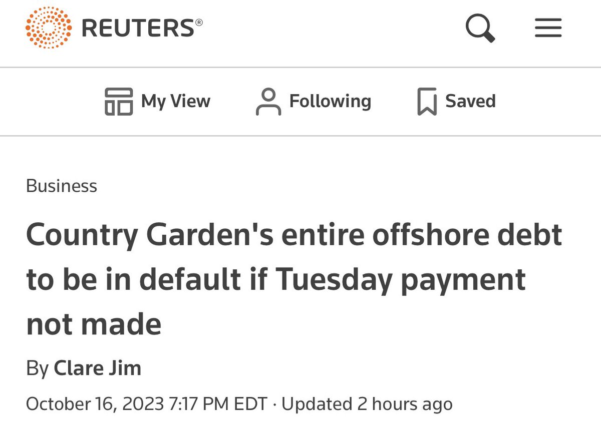 Country Garden's entire offshore debt will be deemed in default if China's largest property developer fails to make a $15M coupon payment on Tuesday, the end of a 30-day grace period Non-payment of this tranche triggers cross defaults in other bonds Country Garden has also missed other offshore payments in the past few weeks though those payments still have not seen their 30-day grace periods lapse With nearly $11B of offshore bonds & $6B of offshore loans, a default by Country Garden would set the stage for one of China's biggest corporate debt restructurings