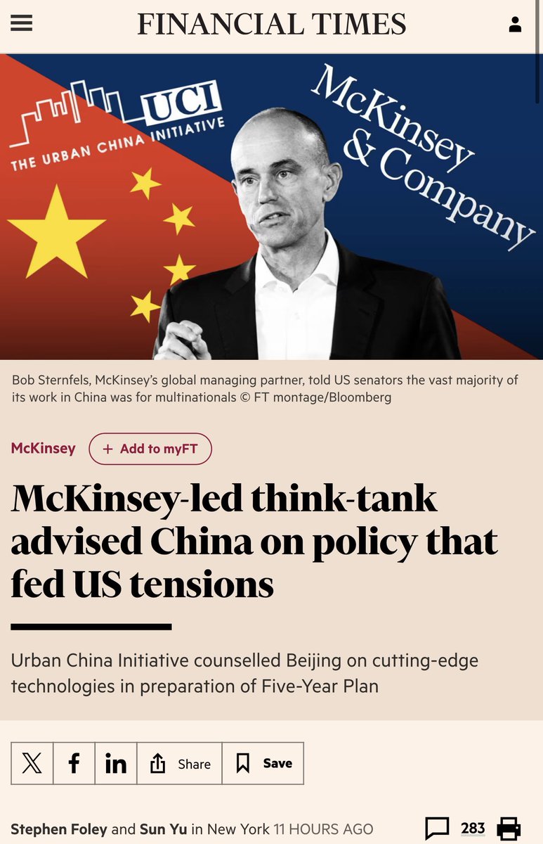 Treasonous: “McKinsey-led think-tank advised China to deepen co-operation between business and the military & push foreign companies out of sensitive industries as part of a project for the central government in 2015. The recommendations in a book by the Urban China Initiative, commissioned by the Chinese government’s central planning agency, were among dozens of policies it proposed to boost the country’s technological prowess, according to a review of the work, which has not previously been reported in western media. …formed part of the Chinese government’s research for its 13th Five-Year Plan covering 2016-20. The Five-Year Plan included the ‘Made in China 2025’ policy that increased tensions between Beijing and Washington. McKinsey shut down UCI in 2021 and has played down its relationship with the Chinese government since coming under political pressure in the US, where lawmakers have questioned if consulting in China conflicts with the firm’s work for the US Department of Defense. In all, it made 61 recommendations across 14 different technologies. One chapter covered advanced materials — a class of product including speciality metals and other materials used in cutting-edge manufacturing — where it recommended China “accelerate the conversion of military technology into civil use [ . . . and] promote the two-way transfer and dissemination of military-civil material technology’. A reliance on foreign suppliers to build China’s cloud infrastructure could lead to the theft of sensitive data from military, economic and government departments and undermine national security, according to another chapter, so that the country should ‘strive to grow its domestic cloud computing industry and prevent core technologies from being controlled by foreign companies’. The book also advocated for the Chinese government to provide more financial support for domestic internet of things companies so they could ‘eventually take control of the industry from foreign firms’.”