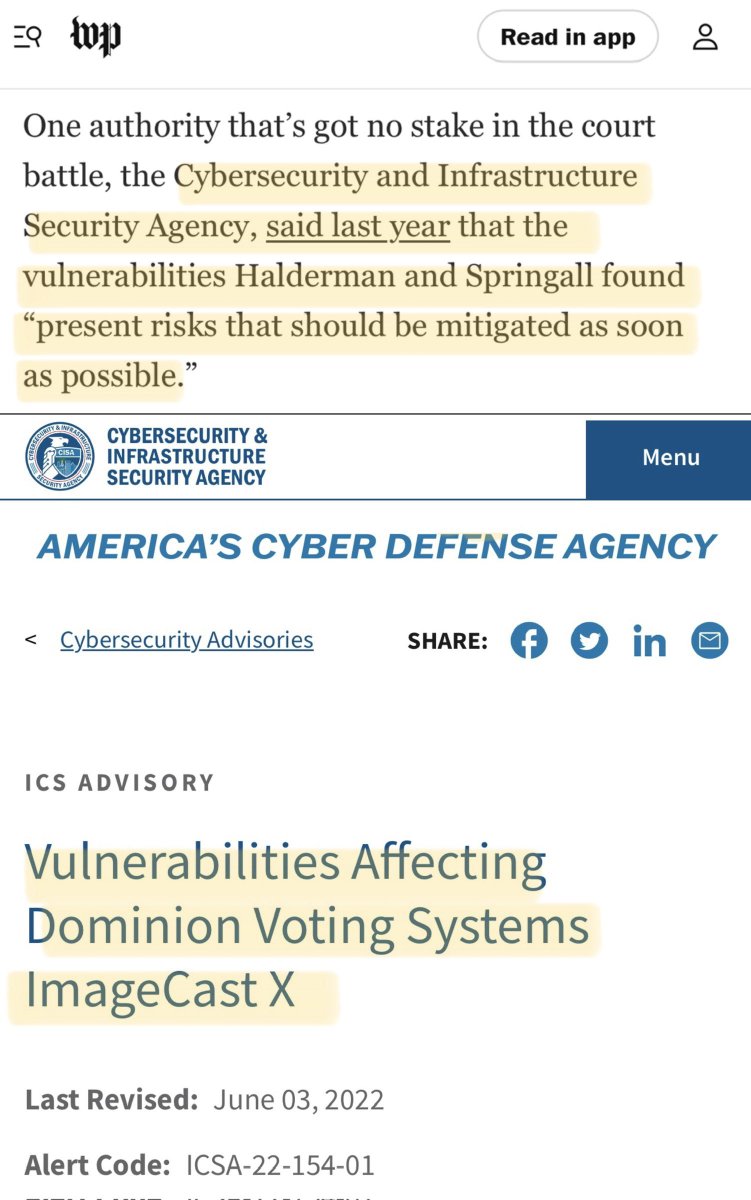 Fun fact: After claiming 2020 was the “most secure election” in US history, @CISAgov fought to delay the release of expert report(s) detailing multiple vulnerabilities in Dominion Voting Systems Machines used in Fulton County, Georgia, & 15 other states during the 2020 election CISA, an agency tasked with ensuring the cyber integrity of US elections, only acknowledged these vulnerabilities due to a lawsuit filed by a 3rd party.