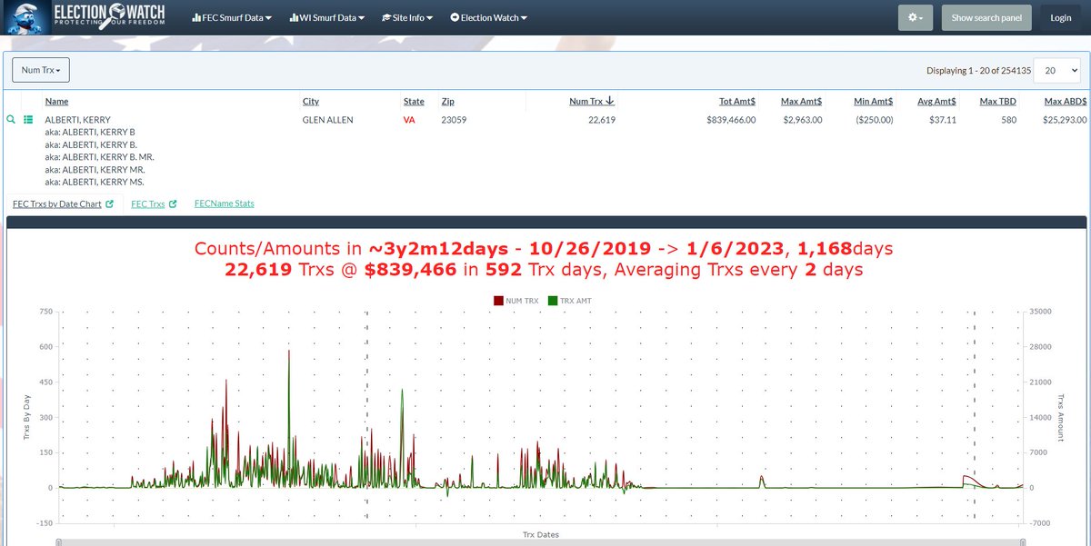 Ghost donor problem. Data thanks to the esteemed @PeterBernegger One Virginia donor. 22,619 transactions totaling $839,466.00. $37.11 average donation. This donor probably donated to one thing once, with the rest being identity theft by an unknown actor. https://t.co/7wVAUbQOch
