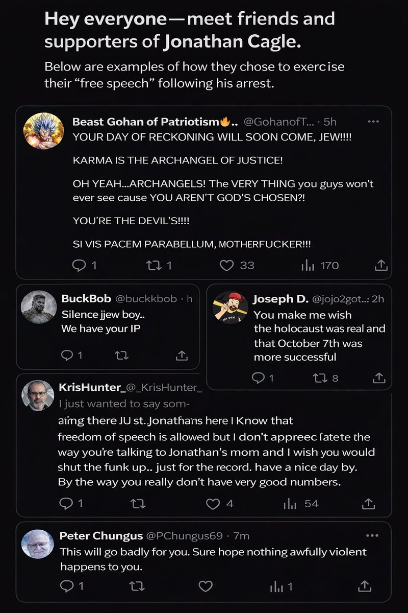 Hey everyone - meet friends and supporters of Jonathan Cagle - the Alabama Neo-Nazi arrested last night by the FBI for cyberstalking. Below are examples of how these low IQ trailer park basement dwellers chose to exercise their “free speech” following Cagle's arrest. These are direct quotes from public replies: @GohanofT… says: “YOUR DAY OF RECKONING WILL SOON COME, JEW!!!! KARMA IS THE ARCHANGEL OF JUSTICE! …YOU AREN’T GOD’S CHOSEN?! YOU’RE THE DEVILS!!!! SI VIS PACEM PARABELLUM, MOTHERFUCKER!!!” @buckkkbob says: “Silence jjew boy.. We have your IP” @jojo2got3lucky5 says: “You make me wish the holocaust was real and that October 7th was more successful” @KrisHunter says: “I know that freedom of speech is allowed but I don’t appreciate the way you’re talking to Jonathan’s mom and I wish you would shut the funk up… By the way you really don’t have very good numbers.” @PChungus69 says: “This will go badly for you. Sure hope nothing awfully violent happens to you.” This is not commentary or interpretation - just a record of what was said, by whom, and how some people choose to respond when scrutiny begins. I guess some people never learn that we are not going to stop until our DOJ prosecutes every single one of these pieces of trash. Your days of pushing Jews around, doxxing and threatening our federal agents are OVER! They never learn, do they? So yeah, bring it on, dick-wads! 🤣🤣🤣 @Yael4Hanover@MaxNordau@Justachirpin7@strett1985@EllenFL214@JohnShock1999@lucasdimos@SharonC97936831@Medi4M4inStre4m@ChikJulie@RichCollins71@Cloudwatch199 @lcagle63