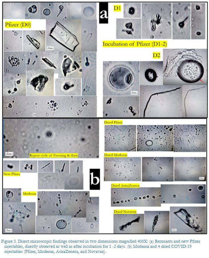 From the study abstract. If this doesn't freak you out what will? “There were animated worm-like entities, discs, chains, spirals, tubes, right-angle structures containing other artificial entities within them, and so forth. All these are exceedingly beyond any expected and acceptable levels of contamination of the COVID-19 injectables, and incubation studies revealed the progressive self-assembly of many artifactual structures. As time progressed during incubation, simple one-and two-dimensional structures over two or three weeks became more complex in shape and size developing into stereoscopically visible entities in three-dimensions. They resembled carbon nanotube filaments, ribbons, and tapes, some appearing as transparent, thin, flat membranes, and others as three-dimensional spirals, and beaded chains. Some of these seemed to appear and then disappear over time. Our observations suggest the presence of some kind of nanotechnology in the COVID-19 injectables.”