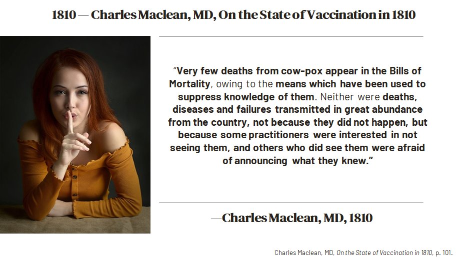 Did you know that in 1810, just a few years (1798) after the vaccination fad took over the medical profession, Charles Maclean, MD, wrote a book On the State of Vaccination in 1810. In it, he commented how deaths from vaccination were suppressed because the vaccinators chose not to see the deaths, and others were afraid to say anything. Sound familiar? “Very few deaths from cow-pox appear in the Bills of Mortality, owing to the means which have been used to suppress knowledge of them. Neither were deaths, diseases and failures transmitted in great abundance from the country, not because they did not happen, but because some practitioners were interested in not seeing them, and others who did see them were afraid of announcing what they knew.” Charles Maclean, MD, On the State of Vaccination in 1810, p. 101.