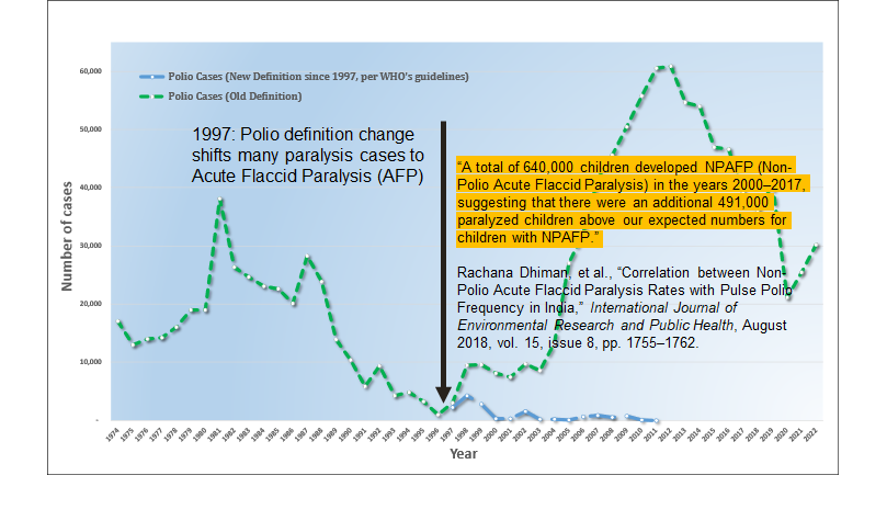 Does Bill Gates or the WHO know or even care? In India in 1997, the definition of polio changed, and many paralysis cases shifted to AFP – Acute Flaccid Paralysis. If we use the old polio definition, we can see paralysis cases have shot up and only began to decline in 2012, with the number of oral polio vaccine (OPV) doses administered to children each year gradually reduced. “(a) Up to 1996 all reported cases of acute flaccid paralysis (AFP) were labeled as polio cases, but no follow up was done. (b) From 1997 onwards, an AFP case has been labeled as polio in the presence of one or more of the following: (i) wild polio virus detected in stool sample, (ii) residual paralysis observed after a period of 60 days of onset of paralysis. (iii) the patient has died, or (iv) the patient is lost to follow up.” Yash Paul, “Polio Eradication Programme: A Failure,” Economic and Political Weekly, vol. 41, no. 43/44, November 4-10, 2006, pp. 4538–4540. “A total of 640,000 children developed NPAFP in the years 2000–2017, suggesting that there were an additional 491,000 paralyzed children above our expected numbers for children with NPAFP.” Rachana Dhiman, Sandeep C. Prakash, V. Sreenivas, and Jacob Puliye, “Correlation between Non-Polio Acute Flaccid Paralysis Rates with Pulse Polio Frequency in India,” International Journal of Environmental Research and Public Health, August 2018, vol. 15, issue 8, pp. 1755–1762.