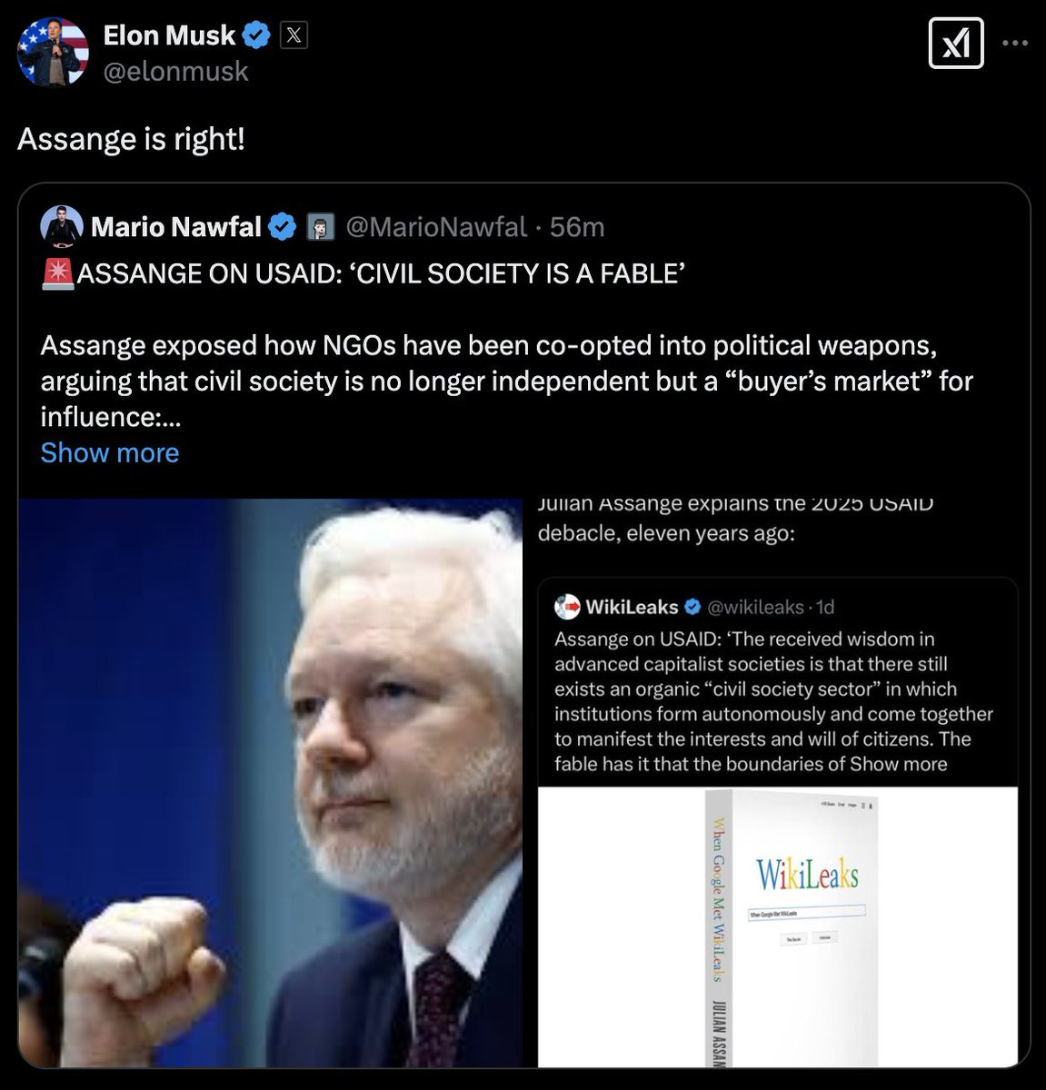 ‘Assange is right’: @elonmusk praises WikiLeaks founder’s 11-yr-old USAID take “The last 40 years have seen a huge proliferation of think tanks and political NGOs whose purpose, beneath all the verbiage, is to execute political agendas by proxy,” Assange wrote in 2014. https://t.co/m9NTL0bV4G
