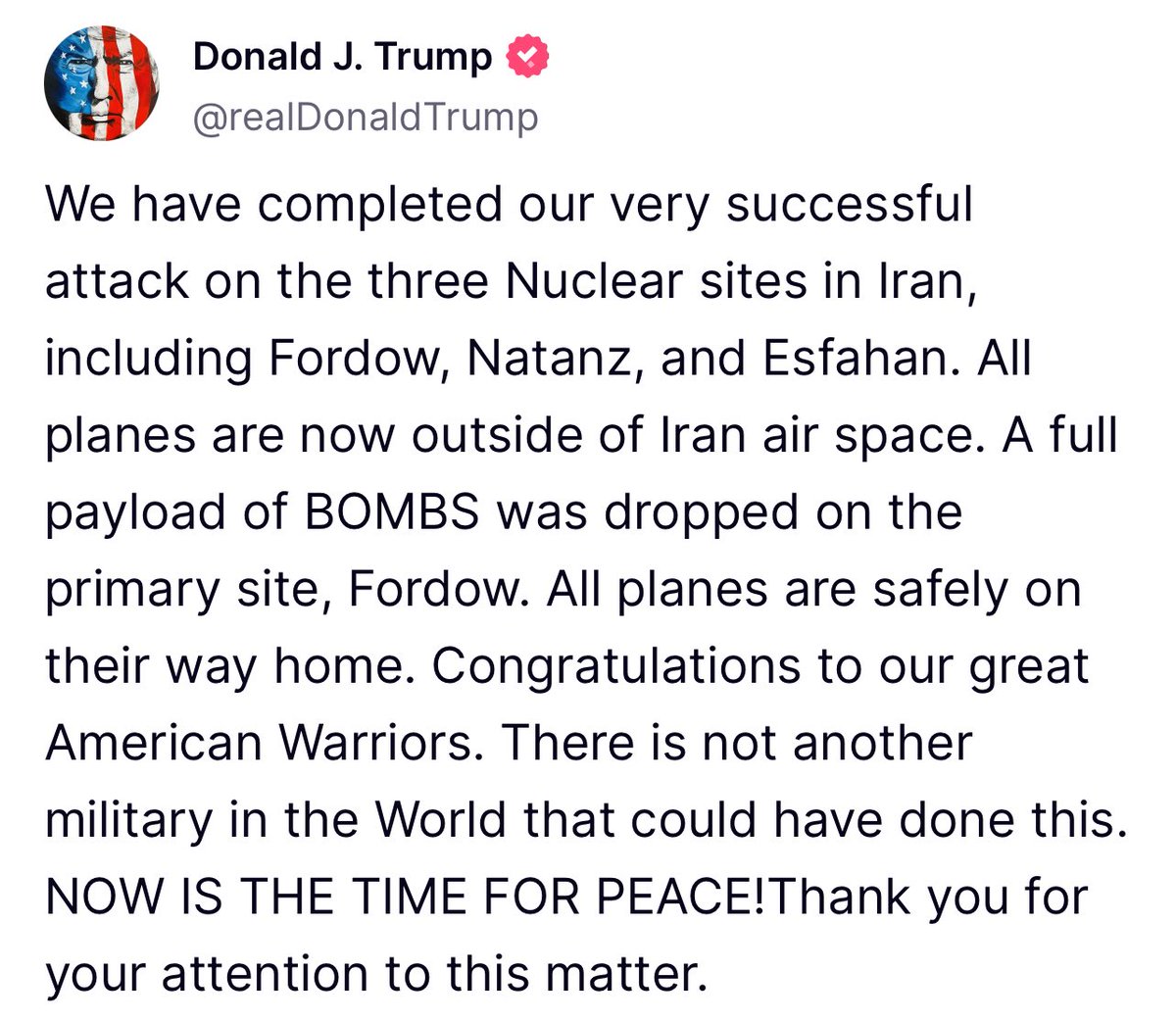 ❗️BREAKING: Trump says United States has BOMBED 3 nuclear sites in Iran Fordow, Natanz, Esfahan https://t.co/PncDhzgJqu