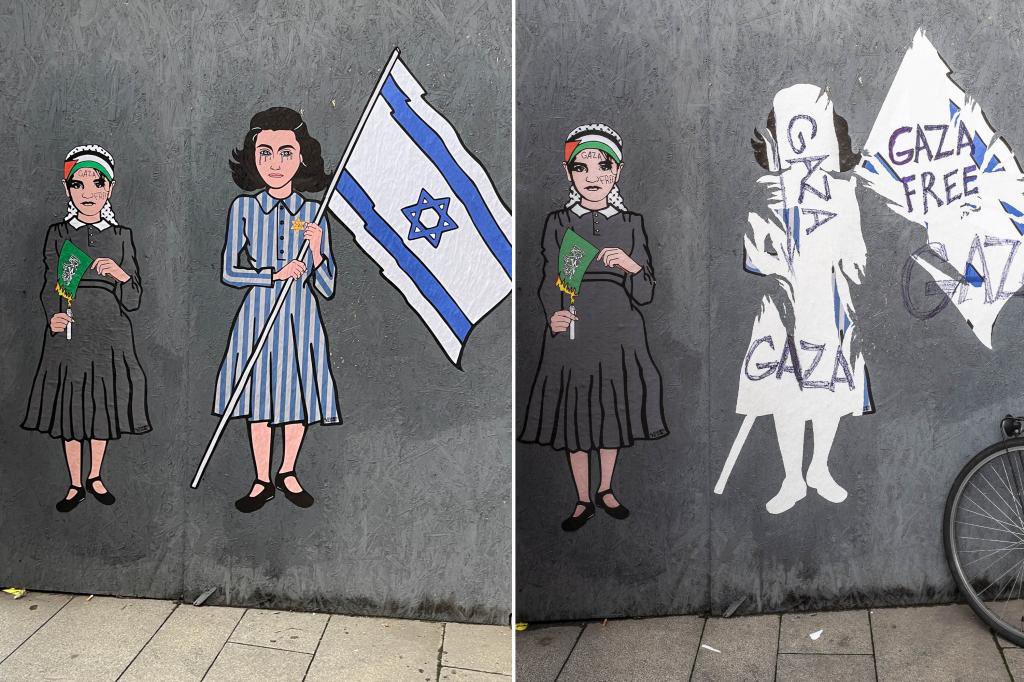 In Italy, the mural of Anne Frank holding the flag of Israel was vandalized with words "GAZA FREE." Tarnishing & desecrating the memory of a young German girl with Jewish origins murdered by the Nazi regime. This behavior will never #FreePalestine. You people have no shame. https://t.co/yvefcpVs5X
