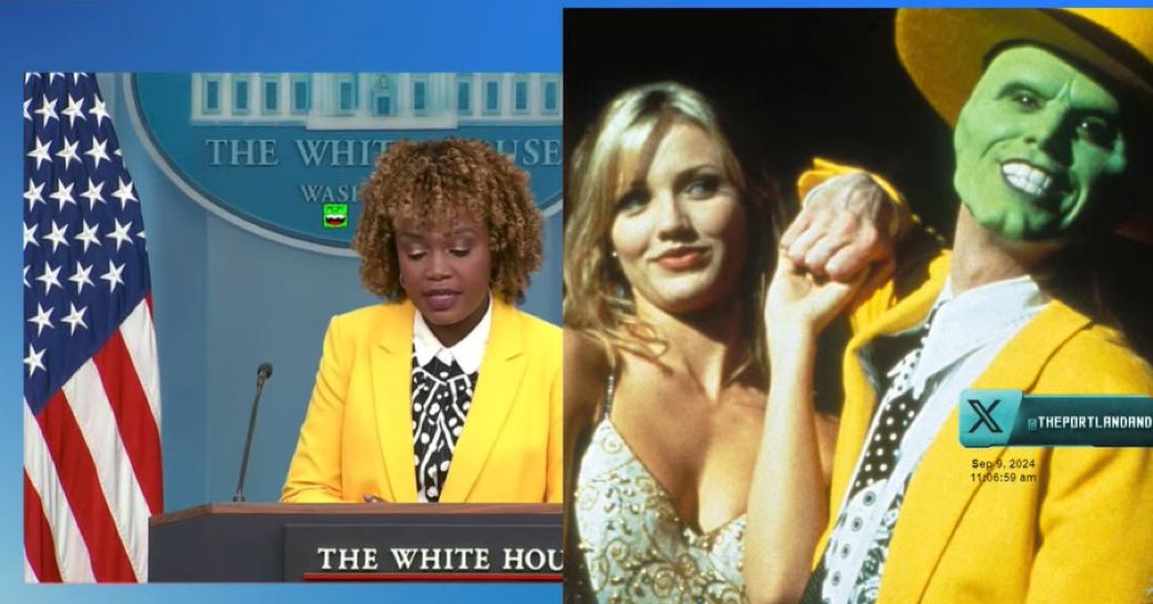 Part 1) 🤯 Is it a coincidence that Biden's press secretary is dressed like the Mask? 🤣 Not to mention she is pointing at Q drops. "Vigilant" 2 times. FF weather alert (WW). Stay vigilant and maintain situational awareness. Chatter. Trains. Buses. Be vigilant. Same day Trump writes a truth about the perverbial "bus"???? Keep your heads on a swivel frens. It's officially false flag season.