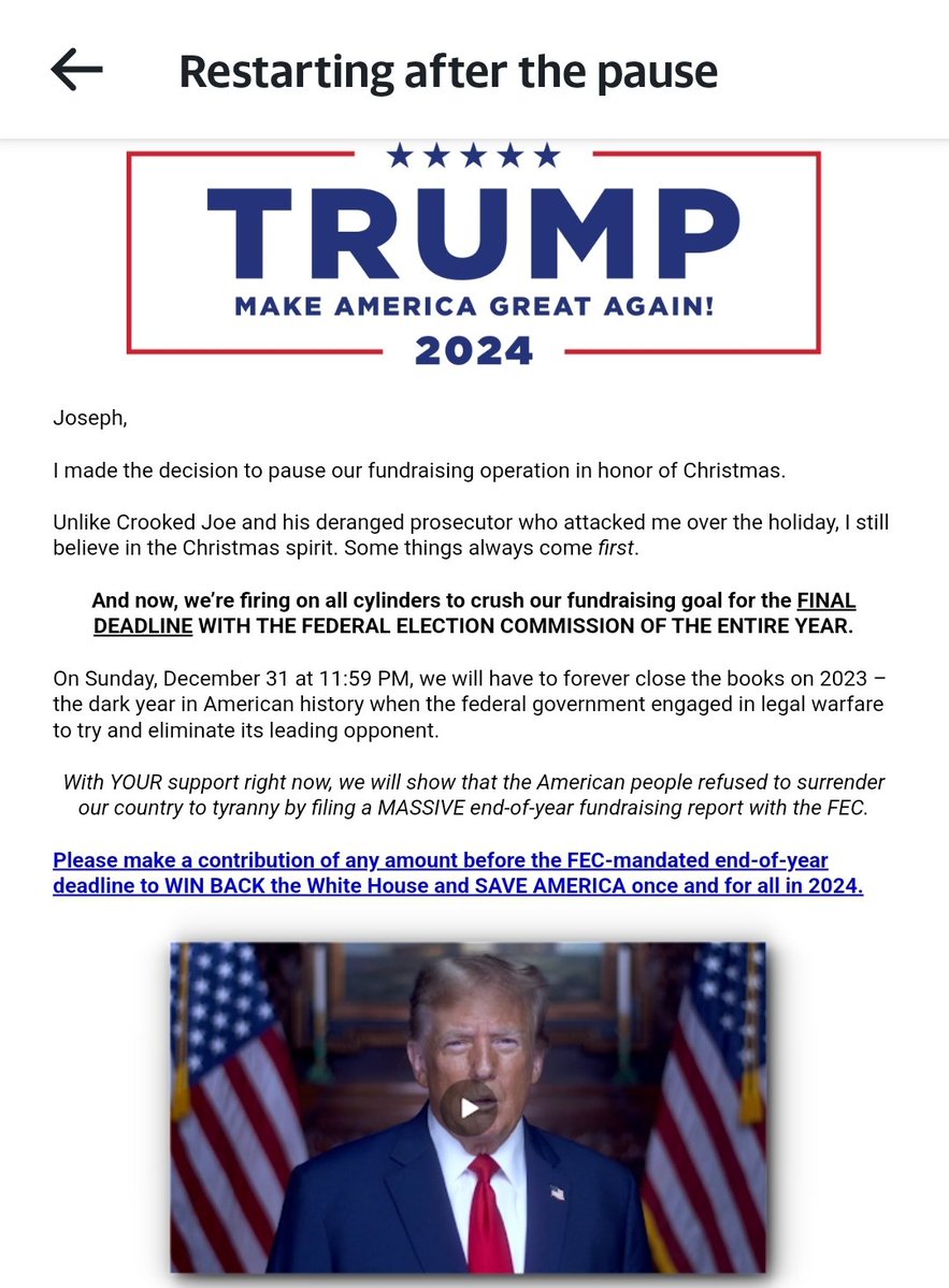 💥HOLY CRAP💥 this is not an accident. COMMS. Anyone that thinks this is not a complete hat tip to the PAUSE would be fooling themselves. Trump sends an email titled "restarting after the PAUSE"?? 😂🤣 " I made the decision to PAUSE our fundraising OPERATION in honor of Christmas" Trump is 117% hat tipping us again.. We are about to restart... After.. The PAUSE. Are y'all ready??! NCSWIC. Video is attached below. H/T @benmccomposer wow bro...