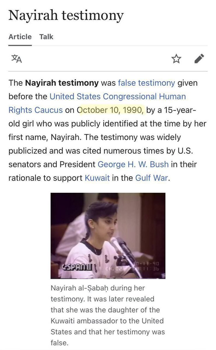 Nayirah Al-Salibah’s testimony was the War Propaganda needed For George H.W. Bush’s war in Iraq Her testimony was rebroadcast across the World and marked a turning point in public opinion on going to War. Daughter of Kuwaiti ambassador to the USA, Coached by PR firm Hill+Knowlton https://t.co/gfx1CoJgn0