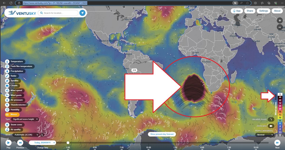 Many people weighing in on this "giant wave anomaly" showing up on multiple systems like Windy, or Ventusky... 80+ foot waves across vast distances were showing up in the "projected models" of current waves forecast for the next few days. The giant dark spot is the area in question . Since it first showed up, it went for several hours on the feed and has since been wiped / disappeared. https://ventusky.com/?p=-21;-58;2&l=wave&t=20240411/1200… Meanwhile, on the OTHER side of South America to the West off the Coast of Conception Chile, a buoy has gone into event mode, dropping thousands of meters in a few hours time. No explanation on that yet either. See here: https://ndbc.noaa.gov and here: https://ndbc.noaa.gov/station_page.php?station=34420&type=2&seriestime=20240411105915… Both sides of South America having strange anomalies on the same day -- at a time where we are looking for a large earthquake in South America to strike Chile most likely. Chile is (was) the antipode of the Taiwan M7.4 a few days back. Antipode means (opposite side of). Thus, North Chile is the opposite side of the Earth from Taiwan. To have a buoy go into event mode dropping thousands of meters in the week we are looking for activity on the antipode of Taiwan at Chile... can't be overlooked. This giant wave anomaly is super suspect, could be anything from a data run simulation (not likely) to a giant iceberg landslide water displacement event (possible), to strange stuff like DEW (not likely but possible), to even more strange stuff like tartaria, great reset and / or antarctica mysticism topics. I've ruled out aliens as the cause by the process of deduction and out of intellectual laziness. LOL