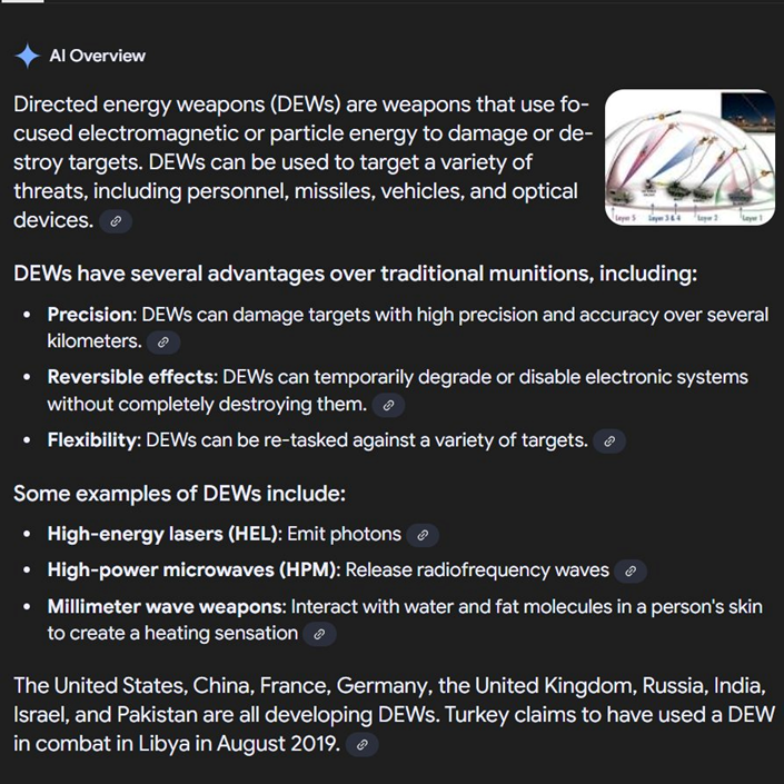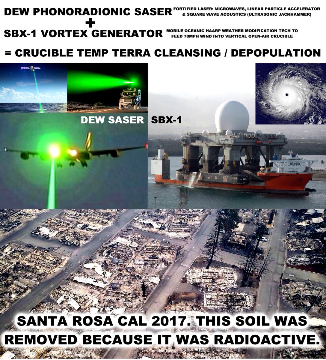 DIRECTED ENERGY WEAPONS (DEWs) While typical civilian access to DEW technology is hyper limited, AI gives more insight into the reality of Directed Energy Weapons as used in combat. However, this is not a very comprehensive snapshot of what DEW munitions really are. First, they are not lasers, but rather known as sasers (sound outside of human audible range) that delivers more than just excited photons as per lasers, but envelopes microwave radiation delivered through linear particle accelerators and amplified by square-wave (jackhammer) ultrasonic concussion exceeding 20,000 pulses per second, where each impact doubles in energy through secondary emissions for every pulse. Secondary emissions are created on-the-spot through Neutrino Events that harvests brand-new energy directly out of atmospheric neutrinos, turning them into new ions. Hence why saser beams deliver more energy to the target than anything short of a nuclear blast. DEWs also actively draw energy out of surrounding capacitors at the scene of the target as well as from local sources in the path of the beam. Microwaves excite the electrons within the target structure, such as car batteries and the electric wires inside homes, that causes additional increase in amplitude. Since the energy being siphoned off is focused in the zero point of the beam, that area creates dual opposing twin vortices at zero target forming a hyperbola in the center of the affected area where the energy collapses in on itself, sucking oxygen out of the air which then amplifies the thermal radiation only within that toroidal vortex area, achieving crucible-level temperatures in an open-air setting. This is hyper-accelerated by the coupling of the SBX-1 mobile Vortex generator that delivers oxygen to the strike zone with hyper-focused accuracy at up to 70+ MPH winds. Which is why target zones see hurricane winds out of nowhere and from clear skies without any clouds. DEWs generate temperatures that are vastly higher than normal house or forest fires; 1200F and 1500F respectively. A self-imploding DEW saser strike can generate thermal signatures high enough to burn terracotta roofing tiles (2100F), melt glass (2900F), and vaporize stucco walls that are rated to hold up for 1 HOUR under direct torch flame, rendering it to tiny traces of powder. Even the concrete slab foundations of homes in the Santa Rosa fire of 2017 had been incinerated and literally gone as if evaporated into the air. Since the air surrounding the strike zone becomes immediately depleted, fire will not be readily sustained anywhere outside of the hyperbola area (just the home or automobile), leaving brush, trees, plastic, within just a few feet away barely seared and, in many cases, totally unscathed altogether. Houses that incinerate all the way down to ash within minutes will leave no soot, or flame marks on white-painted homes as little as ten feet away as if there was no heat or fire present of any kind. It is important to note that a normal house fire takes 3-4 hours to burn down, leaving large portions of the home and contents behind unconsumed. DEW crucible vortex fires consumed homes down to nothing but white ash in Santa Rosa, incinerated within 20 minutes that I observed after pounding on doors in one residential neighborhood of 2 story homes at 2:30 in the morning screaming to get out, then returning to that same location less than a half hour later, with nothing left but smoldering ash. There is nothing ‘normal’ about DEW remains. Kitchen stoves, pots and pans, washers, dryers, water heaters simply vanished. The cast-iron engines in cars just gone with their aluminum alloy wheels and windows melted on the street. Since DEW sasers work through the delivery of microwaves (that are radioactive) through encapsulation within tachyons (like protective bubbles), the resulting debris fields of target areas are also left contaminated, similar to the aftermath of nuclear detonation sites. The sites where homes once stood in the Santa Rosa fire for instance, had to have the soil under the vaporized concrete slabs excavated and stored in radiation containment casks before any new construction could resume, as reported by locals there that were involved in the cleanup. The Lahaina target homes in Maui are still blocked off with absolutely no entrance for any reason for this same reason almost a year and a half later. DEWs have been seen pulling massive arcs from lightning strikes, obviously generated by the extreme excitation of atmospheric particles of the beam, as well as from overhead electrical wires that supercharge the phonon shafts that are invisible to the naked eye unless backlit from flame or sparks. This technology has been shown to cut full size military ships in half from high altitude delivery systems in seconds, rendering all previous forms of explosive armaments, including nuclear warheads, obsolete. All the military weapons delivered from the US and other countries to Ukraine in recent years were outdated and considered unusable in a genuine modern conflict and were therefore literally being disposed of to make room for other, newer forms of weaponry in armories here at home. In other words, they were merely junk. US dark and black ops have had functioning DEW assault systems in place for many decades already. While AI admits to Turkey using them in combat in 2019, the real date of deployment of DEWs goes back more than just centuries, but prior to humans' arrival to earth in 560m BC. A recent use of DEWs shown here from the Great Chicago Fire of 1871. An even more recent DEW ‘Tara Cleansing’ as they’re called, was the Great San Francisco Fire of 1906 that was blamed on a 7.9 earthquake. And yes, the HAARP SBX-1 hurricane generator is also an earthquake generator as well. None of this is new tech, just new to you. Satellite and antigravity drone delivery of such weapons are entirely remotely-controlled, placing no mil soldiers' lives on the line to mount a si