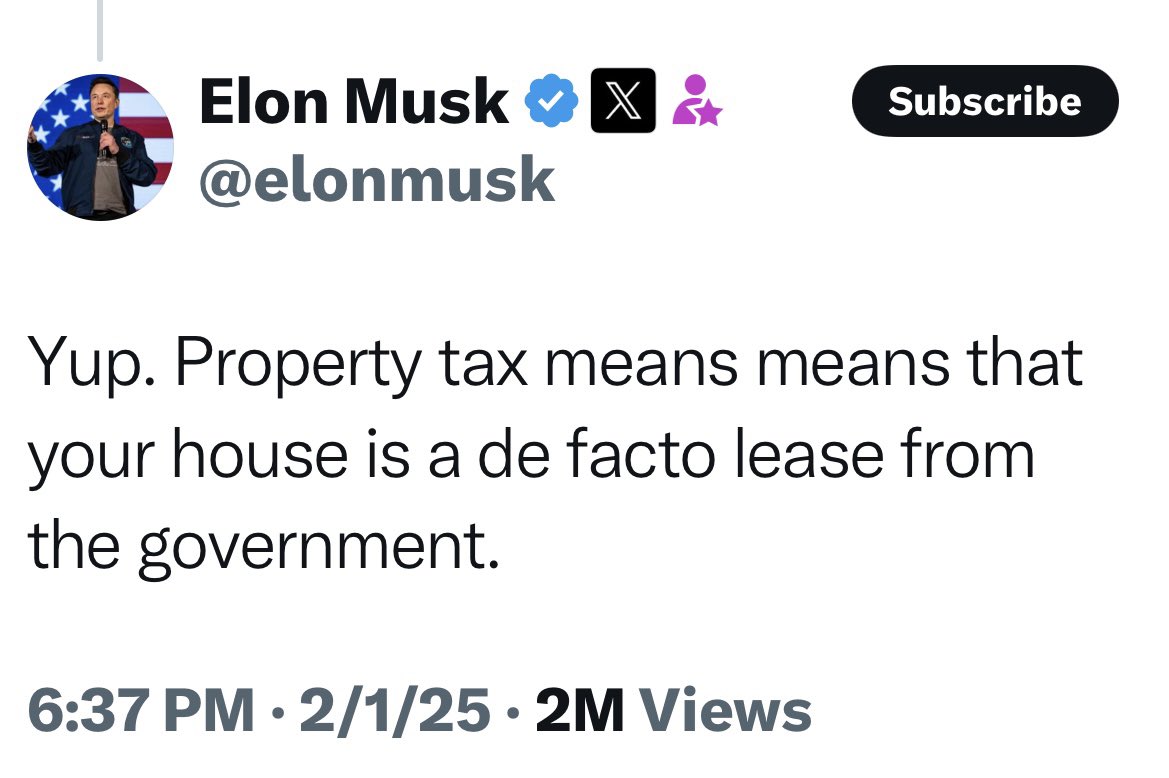 @RealJamesWoods Is Elon Musk eluding that he’s in favor of abolishing property taxes? https://t.co/TMrWWwh9t1