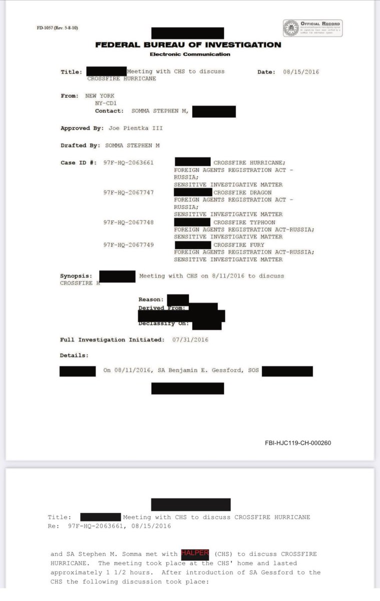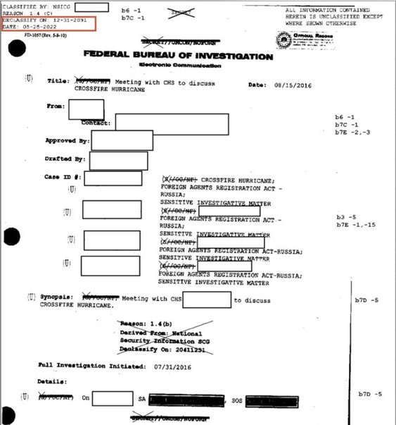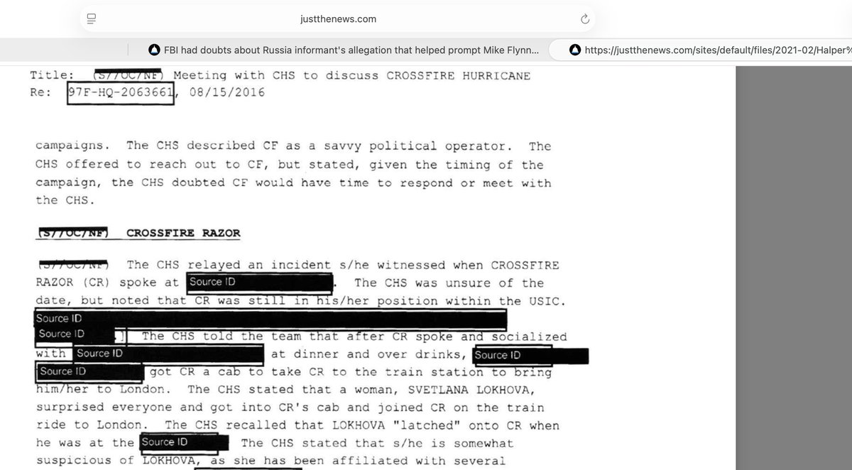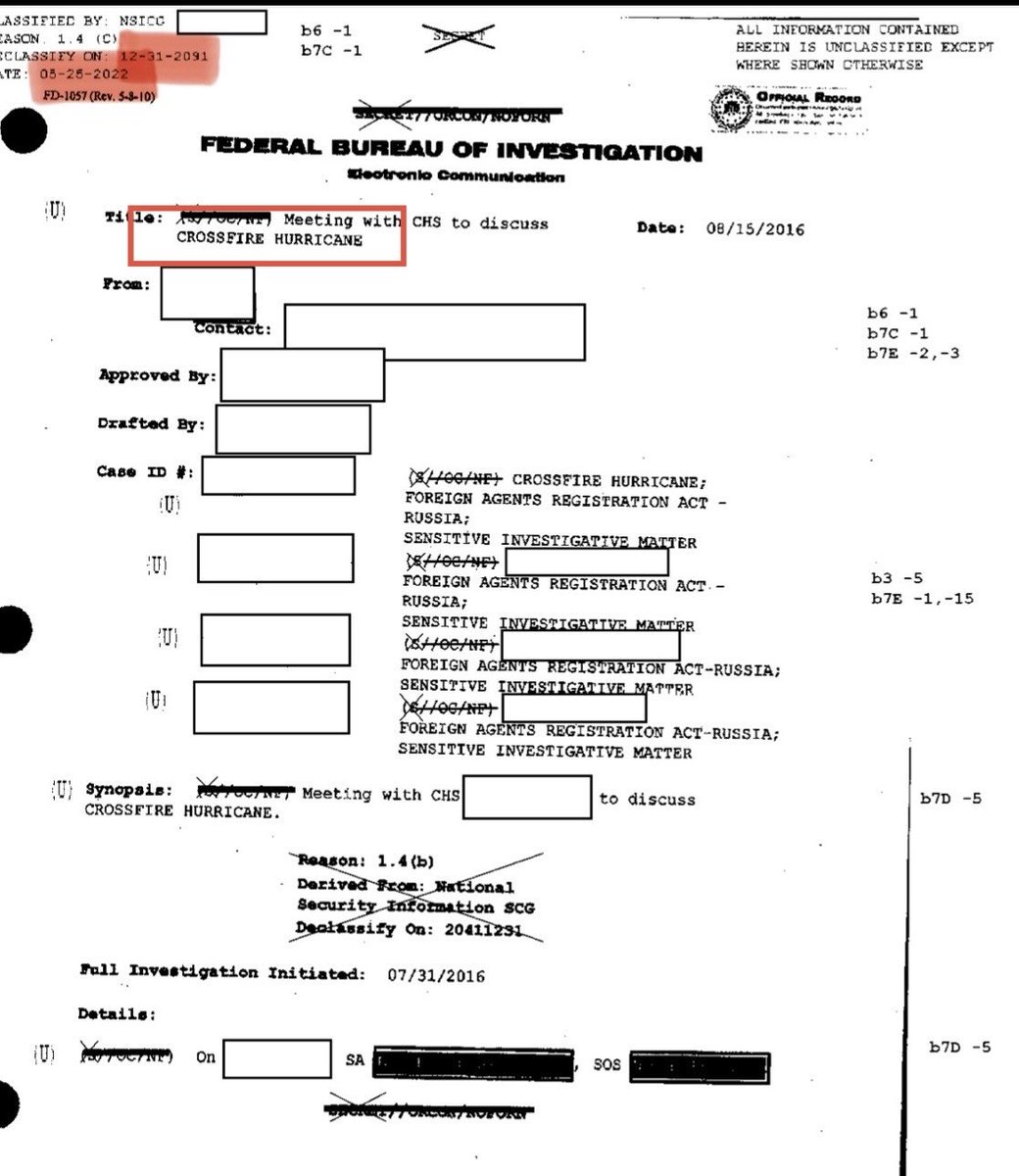 🚨Two months before the Mar-a-Lago raid, Wray's FBI retroactively and secretly re-classified Crossfire Hurricane documents that President Trump DECLASSIFIED in the last week in his first term. Then they hid the documents, they thought forever, they didn't expect President Trump to come back. Then Jack Smith charged President Trump under Espionage Act, accusing him of keeping and distributing classified documents, endangering national security. Look at the stamp on the document on the right, top left corner. Classified until 2091 (effectively forever) on May 25, 2022, two months before the Raid. On the left it’s exactly the same document not classified. This document describes FBI agent Steven Somma meeting with FBI informer and CIA operative Stefan Halper who lied that General Flynn and I had an affair and that I was a Russian spy. This was done to start the Crossfire Hurricane investigation of Donald Trump's advisor General Flynn (RAZOR).