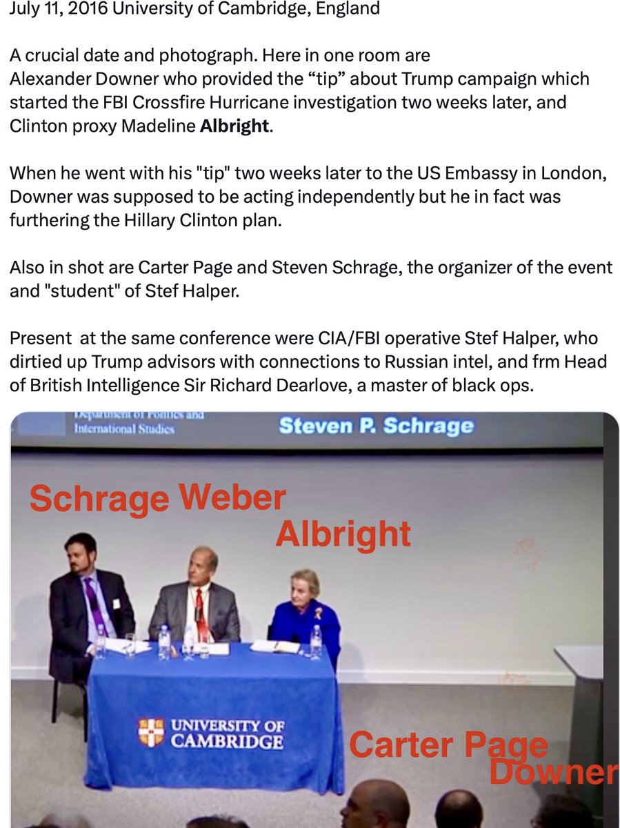 Two weeks before Madeline Albright announced at the DNC convention on July 26, 2016, that Russia interfered to help Donald Trump, Albright was in England with Dearlove, Halper, Downer and other international intelligence operatives, hatching what we now know as the Hillary Plan. https://t.co/Hjgs87YHw0