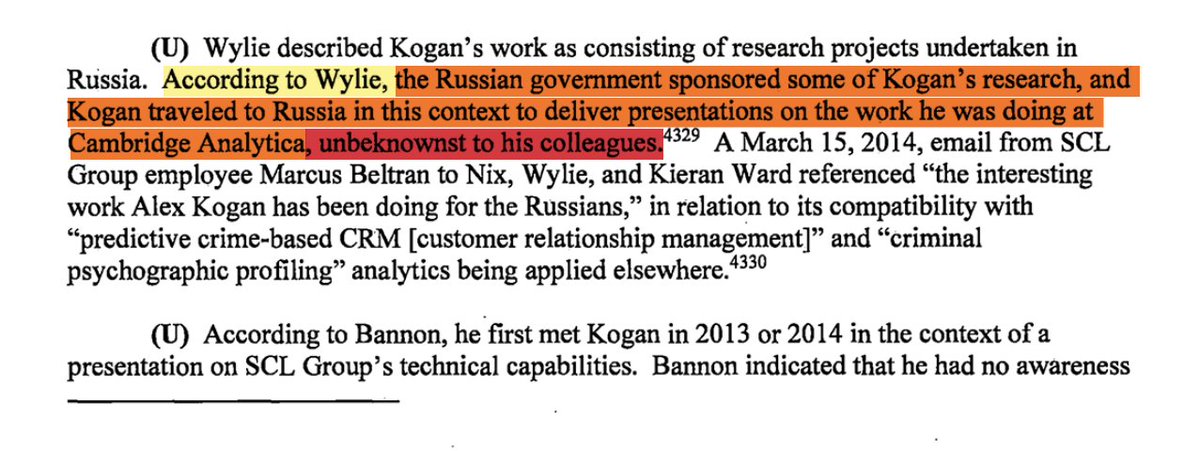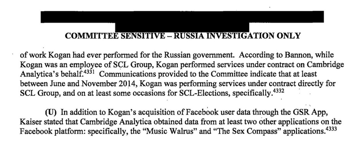 Unbeknownst to his colleagues, the founder of Cambridge Analytica - Aleksandr Kogan traveled to Russia to give presentations and collect funding from the Russian government. Bannon says that Kogan performed services under contract on Cambridge Analytica's behalf, without his knowledge. Cambridge Analytica created at least two other apps to collect psychological data from Facebook users, the "Music Walrus" and "The Sex Compass" applications.