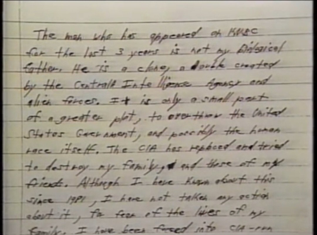 Gary Stollman's manifesto: "The man who has appeared on NBC for the last 3 years is not my biological father. He is a clone, a double created by the Central Inteligence Agency and alien forces. It is only a small part of a greater plot to overthrow the United States Government, and possibly the human race itself. The CIA has received orders to destroy my family and those of my friends. Although I have known about this since 1981, I have not taken any action about it, for fear of the lives of my family. I have been forced into CIA-run..."