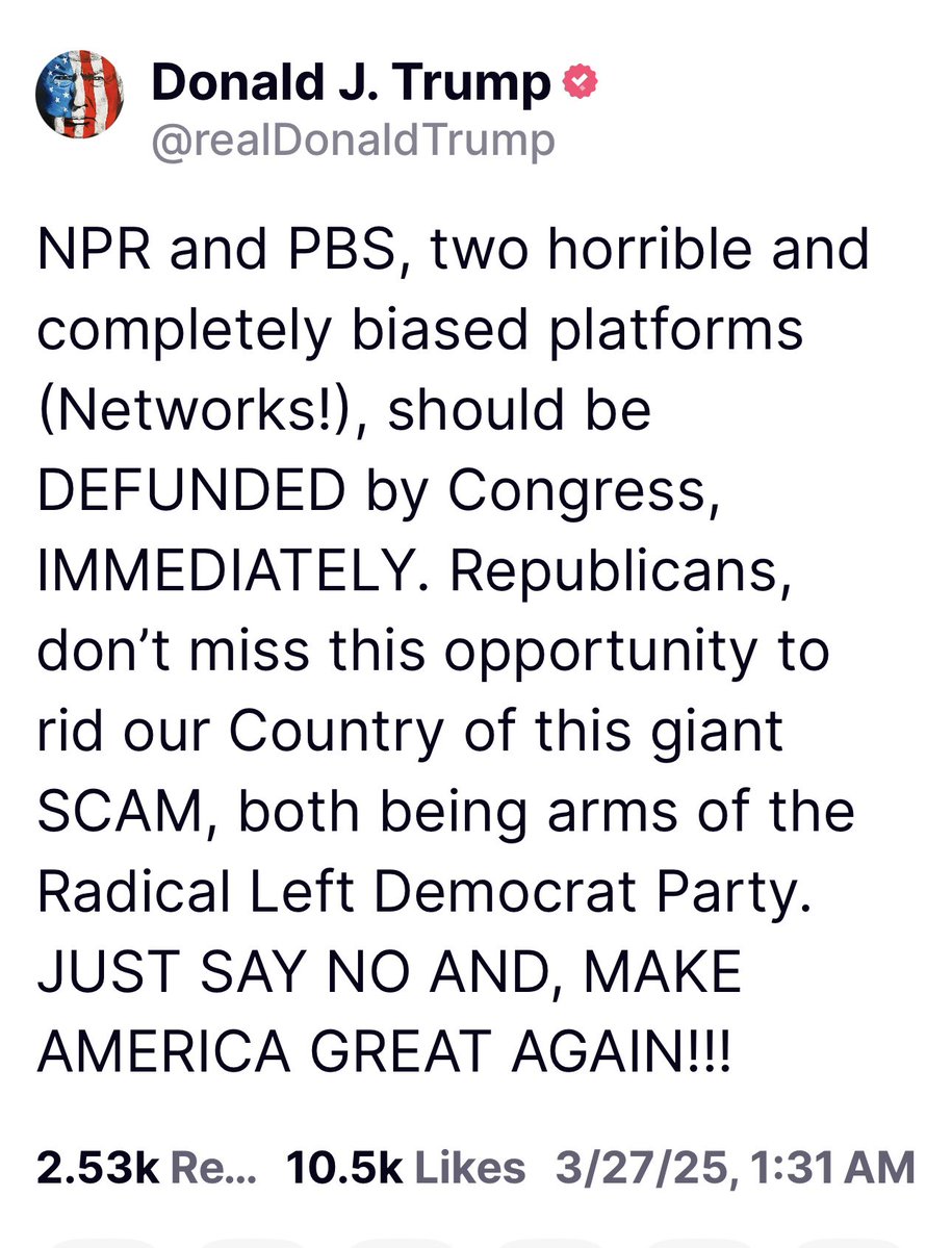 Yes sir, Mr. President! We will defund NPR and PBS!! The American people will NOT pay for disgusting Democrat propaganda anymore!! https://t.co/vD776ZEUl3