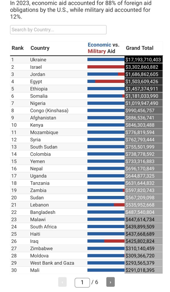 Most recent full year of annual foreign aid funding- 2023, however Ukraine received far more in military aid. Basically the U.S. pays off countries, with some being paid based on how they treat number 2 on the list, which has nuclear weapons. All while we continue the death spiral of national debt which is now $37 trillion. Millennials and Gen Z are seriously struggling financially and Congress refuses to stop sending 70+++ billion/year to foreign countries. My children are Gen Z and I’m Gen X. As a mother and a woman who has absolutely fully lived the American dream, I’m so incredibly angry and disgusted at what decades of America LAST Washington DC has done to young people’s future. Nothing against any foreign country or any foreign people, but I’m America ONLY. I only work for my country, the United States of America. No more foreign wars and no more foreign aid (bribes)!!!!!