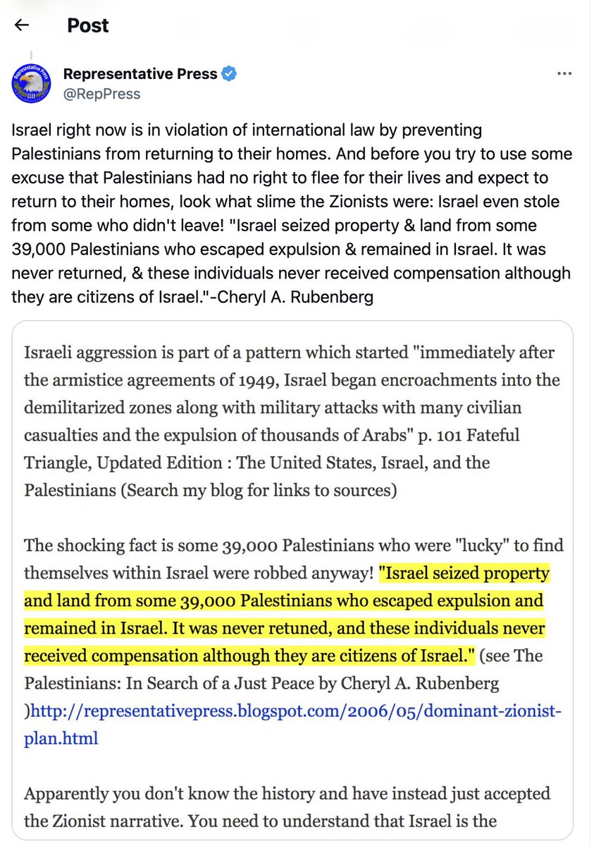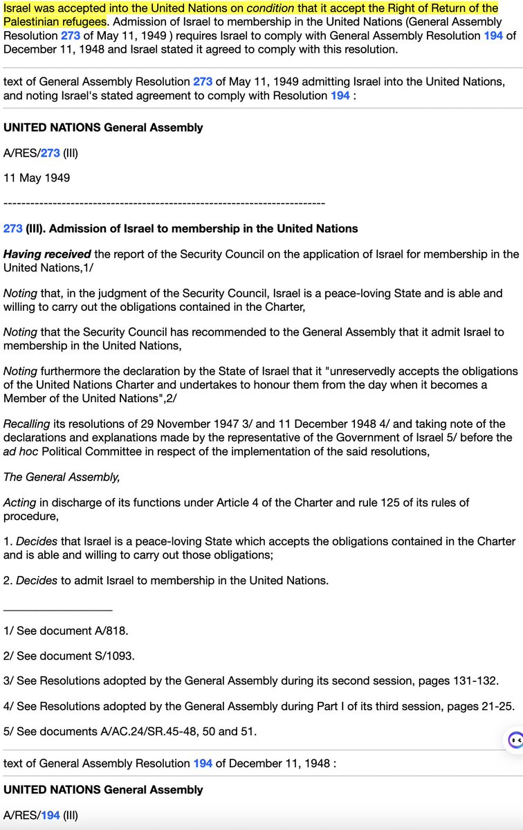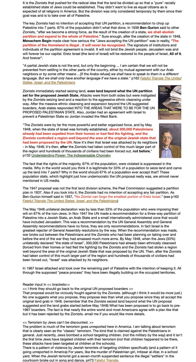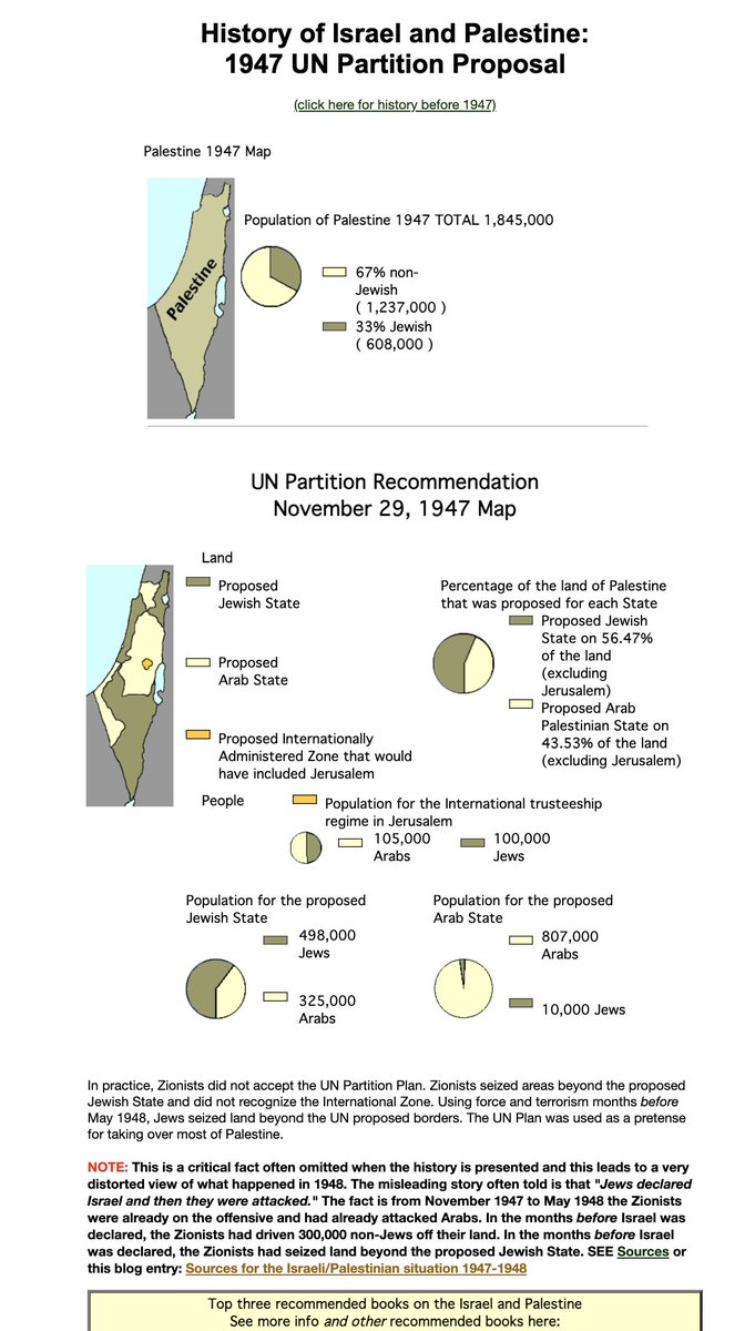 That's false. In 1947, the UN made a PROPOSAL to divide Palestine into 7 sections and the overwhelming majority rejected the proposal as was their democratic right. the UN had a proposal that violated the rights of the overwhelming majority: 67% The UN did not sanction what Zionist Israel imposed. Here is the UN proposal and after the Zionists and Israel's war of aggression, Israel was accepted into the UN on condition that it allow the right of return, Israel IS REQUIRED TO ALLOW THE PALESTINIANS TO RETURN ACCORDING TO INTERNATIONAL LAW! Israel was accepted into the United Nations on condition that it accept the Right of Return of the Palestinian refugees. Admission of Israel to membership in the United Nations (General Assembly Resolution 273 of May 11, 1949 ) requires Israel to comply with General Assembly Resolution 194 of December 11, 1948 and Israel stated it agreed to comply with this resolution. In practice, Zionists did not accept the UN Partition Plan. Zionists seized areas beyond the proposed Jewish State and did not recognize the International Zone. Using force and terrorism months before May 1948, Jews seized land beyond the UN proposed borders. The UN Plan was used as a pretense for taking over most of Palestine. NOTE: This is a critical fact often omitted when the history is presented and this leads to a very distorted view of what happened in 1948. The misleading story often told is that "Jews declared Israel and then they were attacked." The fact is from November 1947 to May 1948 the Zionists were already on the offensive and had already attacked Arabs. In the months before Israel was declared, the Zionists had driven 300,000 non-Jews off their land. In the months before Israel was declared, the Zionists had seized land beyond the proposed Jewish State. In practice, Zionists did not accept the UN Partition Plan. Zionists seized areas beyond the proposed Jewish State and did not recognize the International Zone. Using force and terrorism months before May 1948, Jews seized land beyond the UN proposed borders. The UN Plan was used as a pretense for taking over most of Palestine. NOTE: This is a critical fact often omitted when the history is presented and this leads to a very distorted view of what happened in 1948. The misleading story often told is that "Jews declared Israel and then they were attacked." The fact is from November 1947 to May 1948 the Zionists were already on the offensive and had already attacked Arabs. In the months before Israel was declared, the Zionists had driven 300,000 non-Jews off their land. In the months before Israel was declared, the Zionists had seized land beyond the proposed Jewish State. SEE Sources or this blog entry: Sources for the Israeli/Palestinian situation 1947-1948 Top three recommended books on the Israel and Palestine See more info and other recommended books here: Recommended Books on Israel and Palestine The Gun and the Olive Branch, Fateful Triangle and Image and Reality of the Israel-Palestine Conflict It is the Zionists that pushed for the radical idea that the land be divided up so that a "pure" racially established state of Jews could be established. They didn't want to live as equal citizens as is expected of all religions in America. But the division was only considered temporary by them since their goal was and is to take over all of Palestine. The key Zionists had no intention of accepting that UN partition, a recommendation to chop up Palestine into 7 parts. 67% of the population didn't what that done. In 1938 Ben-Gurion said to other Zionists, “after we become a strong force, as the result of the creation of a state, we shall abolish partition and expand to the whole of Palestine.” Sure enough, after the creation of the state in 1948, Menachem Begin made clear how serious the “Jews accepting the UN partition” was in reality, “The partition of the Homeland is illegal . It will never be recognized. The signature of institutions and individuals of the partition agreement is invalid. It will not bind the Jewish people. Jerusalem was and will forever be our capital. Eretz Israel (the land of Israel) will be restored to the people of Israel, All of it. And forever”. "A partial Jewish state is not the end, but only the beginning ... I am certain that we will not be prevented from settling in the other parts of the country, either by mutual agreement with our Arab neighbors or by some other means ...[If the Arabs refuse] we shall have to speak to them in a different language. But we shall only have another language if we have a state." p162 Fateful Triangle The United States, Israel, and the Palestinians Zionists immediately started seizing land, even land beyond what the UN partition set for the proposed Jewish State. Attacks were from both sides but were instigated by the Zionists seizing land and a reaction to the aggressive ethnic cleansing under way. After the massive ethnic cleansing and expansion beyond the UN suggested boarders, Arab states responded INTO THE AREAS THAT WERE TO BE FOR THE UN PROPOSED PALESTINIAN STATE. Also, Jordan had an agreement with Israel to prevent a Palestinian State so Jordan invaded the West Bank. 📷"The Zionists were by far the more powerful and better organized force, and by May 1948, when the state of Israel was formally established, about 300,000 Palestinians already had been expelled from their homes or had fled the fighting, and the Zionists controlled a region well beyond the area of the original Jewish state that had been proposed by the UN. Now it's then that Israel was attacked by its neighbors - in May 1948; it's then, after the Zionists had taken control of this much larger part of the region and hundreds of thousands of civilians had been forced out, not before." p132 Understanding Power: The Indispensable Chomsky The fact that the rights of the majority, 67% of the population, were violated is suppressed in the media. Why in the world would you think it is legit