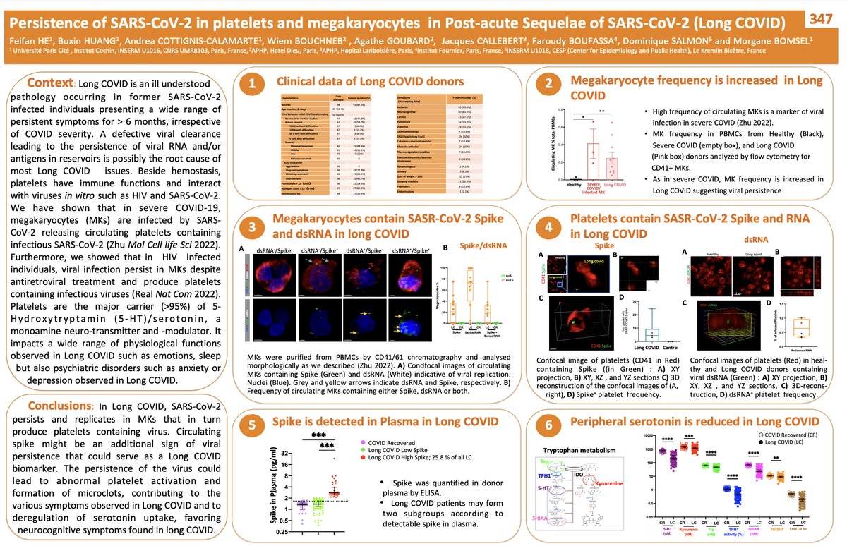Mécanisme d'action pour le Covid long: "Chez les patients développant un COVID long, le SARS-CoV-2 persiste et se réplique dans les MK (mégacaryocytes) produisant des plaquettes contenant du virus." "La présence de spike dans le plasma pourrait être un signe supplémentaire de persistance virale qui pourrait être utilisé comme biomarqueur du COVID long. La présence du virus pourrait entraîner une activation anormale des plaquettes et la formation de microcaillots, ce qui contribuerait aux divers symptômes et à la dérégulation de l'absorption de la sérotonine, contribuant aux symptômes neurocognitifs observés dans le COVID à long terme." https://www.croiconference.org/abstract/persistence-of-sars-cov-2-in-platelets-and-megakaryocytes-in-long-covid/