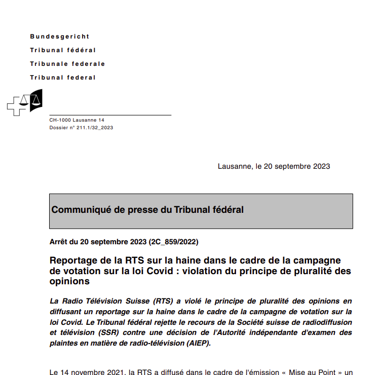 La justice a tranché. Un commentaire, @RTSinfo? "La Radio Télévision Suisse (RTS) a violé le principe de pluralité des opinions en diffusant un reportage sur la haine dans le cadre de la campagne de votation sur la loi Covid. Le Tribunal fédéral rejette le recours de la Société suisse de radiodiffusion et télévision (SSR) contre une décision de l'Autorité indépendante d'examen des plaintes en matière de radio-télévision (AIEP)." "Le reportage ne donne guère la parole aux opposants à la loi Covid et donne par trop l'impression que lesdits opposants sont majoritairement rustres et violents. Il ne relève pas suffisamment le fait que les opposants à la loi Covid ne se réduisent en aucun cas à des théoriciens du complot et à des personnes enclines à la violence. Le reportage fait de surcroît plusieurs fois directement référence à la votation. Le principe de pluralité des opinions n'a dès lors pas été respecté en raison d'une présentation des évènements non suffisamment équilibrée, immédiatement avant les votations" https://bger.ch/files/live/sites/bger/files/pdf/fr/2c_0859_2022_yyyy_mm_dd_T_f_12_41_15.pdf