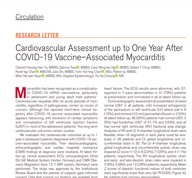 Myocardites vaccinales chez les adolescents, étude de suivi des patients de l'étude de Hong-Kong: "À notre connaissance, il s'agit de l'étude de suivi la plus longue réalisée à ce jour avec une évaluation et une imagerie cardiaques complètes de patients adolescents chez qui une myocardite associée au vaccin COVID-19 a été diagnostiquée. La fonction ventriculaire systolique globale semble préservée. Cependant, on a observé une altération de la déformation myocardique du ventricule gauche et du ventricule gauche et une persistance de la LGE dans un sous-ensemble significatif de patients jusqu'à un an de suivi. Des données de plus en plus nombreuses suggèrent un pronostic plus défavorable en présence d'une altération de la déformation du myocarde et d'une LGE chez les patients atteints de myocardite. Une étude à court terme a fait état d'une déformation longitudinale anormale du ventricule gauche dérivée de la CMR et d'une LGE chez 70 à 75 % des patients adolescents atteints de myocardite associée au vaccin COVID-19 et suivis pendant 3 à 8 mois. Des résultats CMR similaires ont été trouvés chez de jeunes adultes étudiés 3 à 6 mois après le diagnostic initial. Les implications de l'altération de la déformation systolique et diastolique du myocarde et du LGE dans notre sous-groupe de patients ne sont pas claires. Néanmoins, étant donné que l'altération de la déformation du myocarde et la LGE sont des indicateurs de dysfonctionnement et de fibrose subcliniques du myocarde, il existe un effet potentiel à long terme sur la capacité d'exercice et la réserve fonctionnelle cardiaque pendant l'effort." https://ncbi.nlm.nih.gov/pmc/articles/PMC10373639/