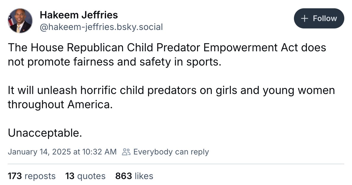 Hakeem Jeffries says keeping men out of women's sports will "unleash horrific child predators" on girls? No. That's what NOT having this bill has done. This is really who the Dems propped up as their hopeful Speaker of the House... https://t.co/AX1ddFUmwL