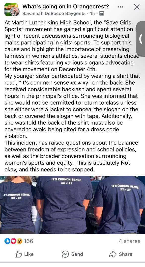 Heartbreaking. - MLK HS compared a shirt two girls wore that said “Save Girls Sports” to wearing a swastika - 150+ students wore the same shirt to school to support the girls - The school punished the students by issuing dress code violations & barring them from attending class https://t.co/FXKRRSda9d
