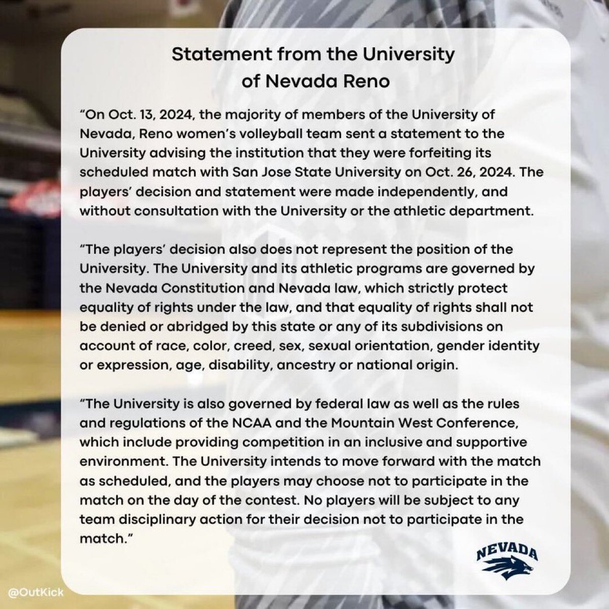 INSANE response from @unevadareno after the women's volleyball team decided to forfeit their match against SJSU. This is the intimidation & emotional blackmail that girls face when they stand up for themselves. Hold the line girls, @NevadaWVB. We're all behind you! BOYcott https://t.co/k8JQPL8aEQ