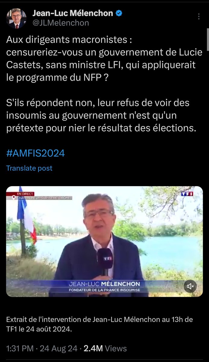 Which brings me to what happened this morning, an incredible gamble by Mélenchon who asked an open question to Macron: "Say we committed to no LFI members in the government, would you nominate Lucie Castets Prime Minister?" https://t.co/PEWfenXRgg