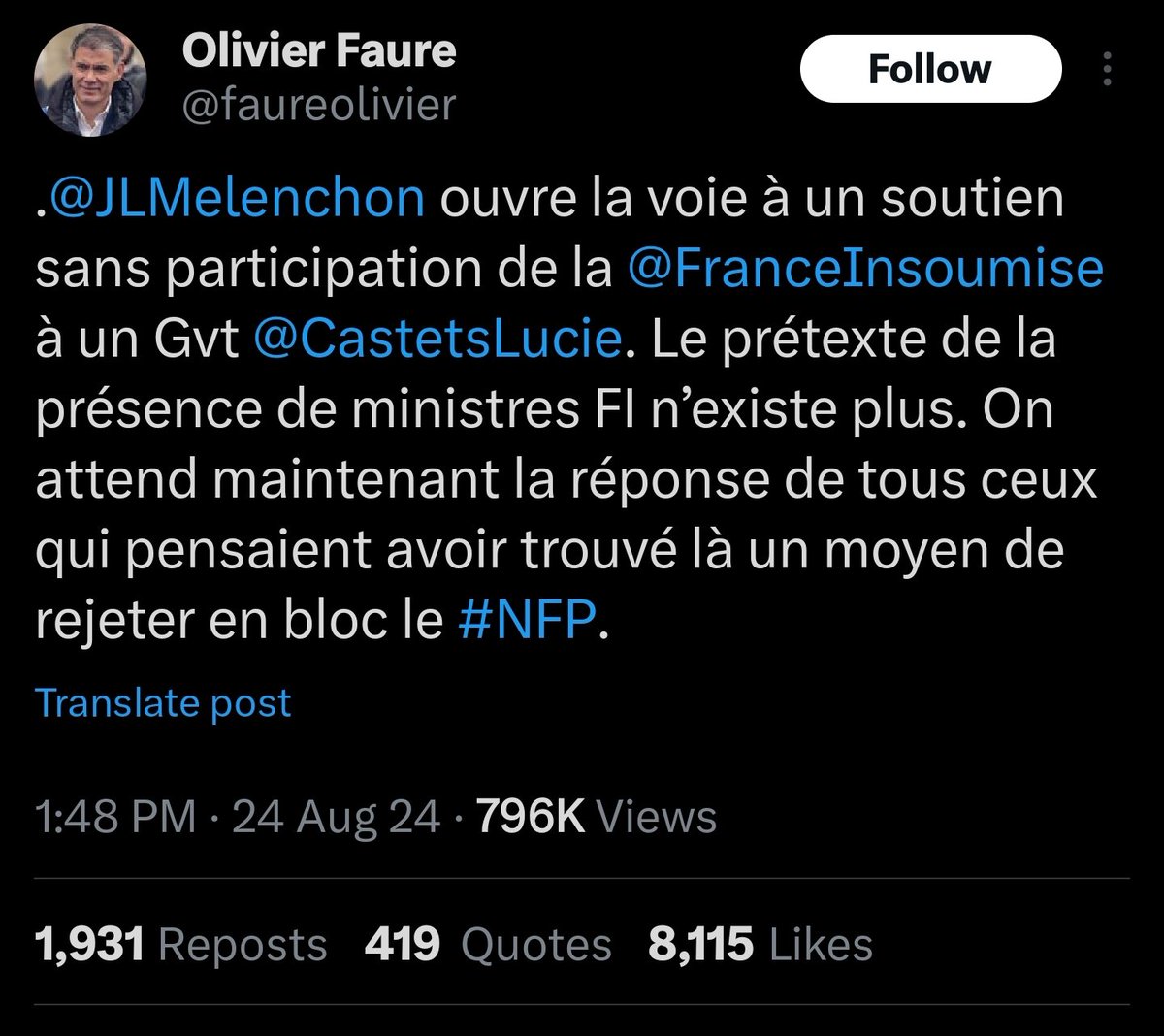 Olivier Faure, who leads the Socialist party (the other big political force in the New Popular Front) backs up Mélenchon and says the "pretext of the presence of LFI ministers" isn't valid anymore. https://t.co/D6Lns6MBay