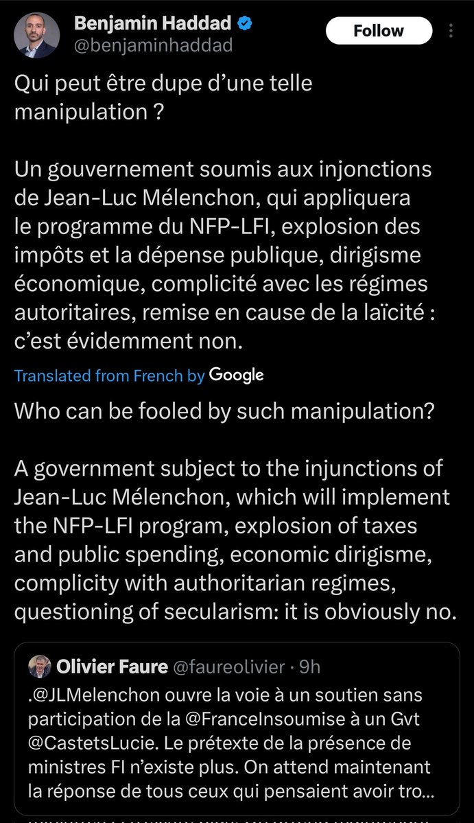 We've already had some of Macron's lieutenants reply such as Benjamin Haddad (former spokesperson for Macron's party in the French parliament) who literally says that a New Popular Front gvt is unacceptable either way because it'd be bad for France. They get to decide this? 🤔 https://t.co/DU5ZMWlUBb