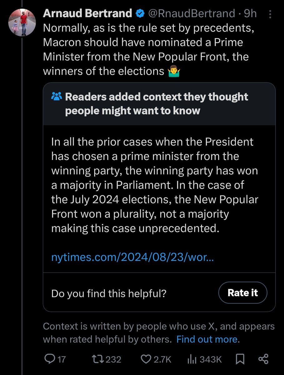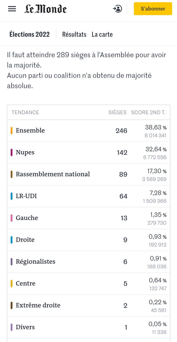 I got this community note 👇 in the thread, which is NOT true. In the elections of 2022 - the prior ones - Macron's party arrived first without winning a majority yet Macron didn't hesitate to nominate a Prime Minister from his own party 🤷♂️ https://t.co/PJJ60P6ZPB